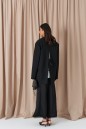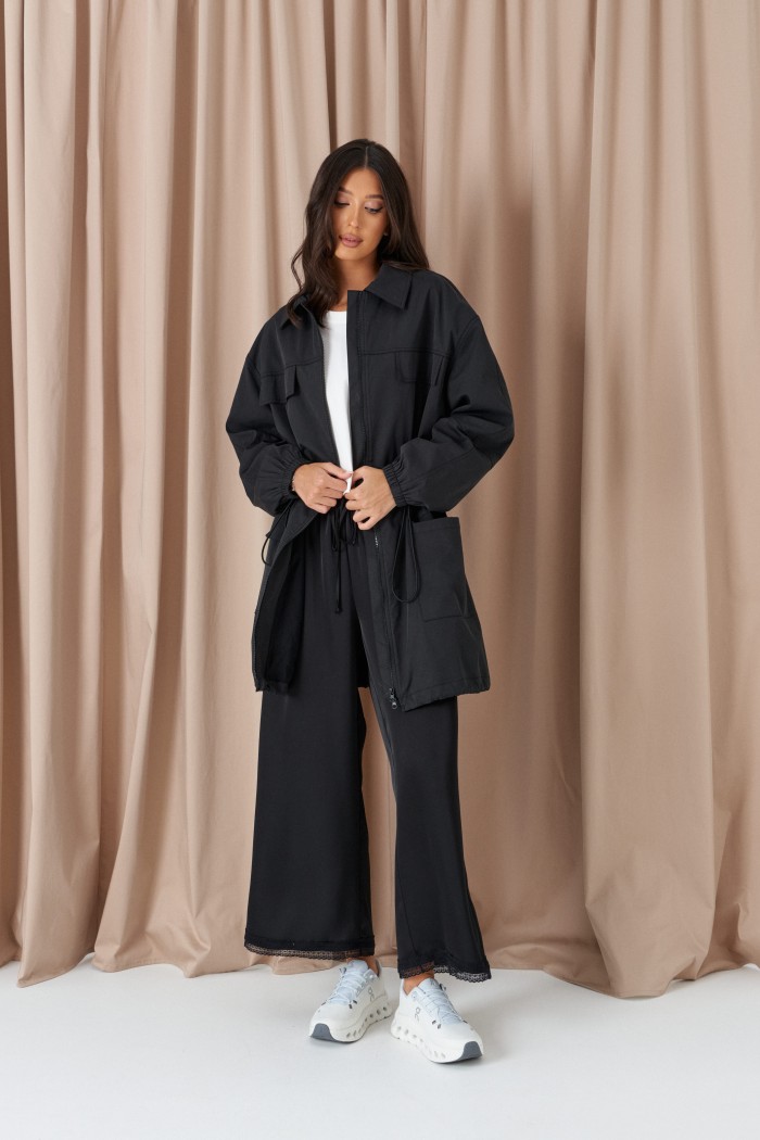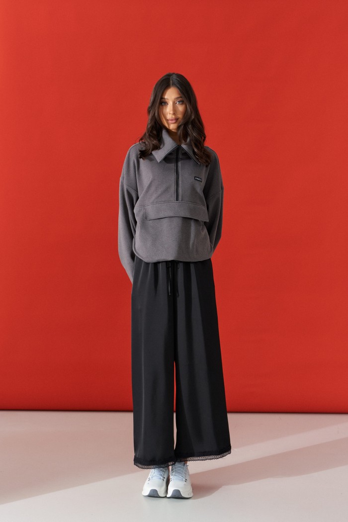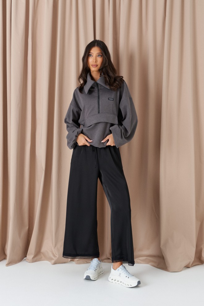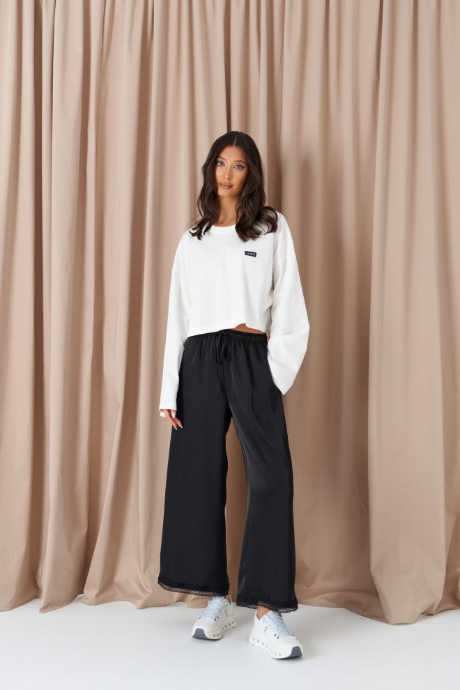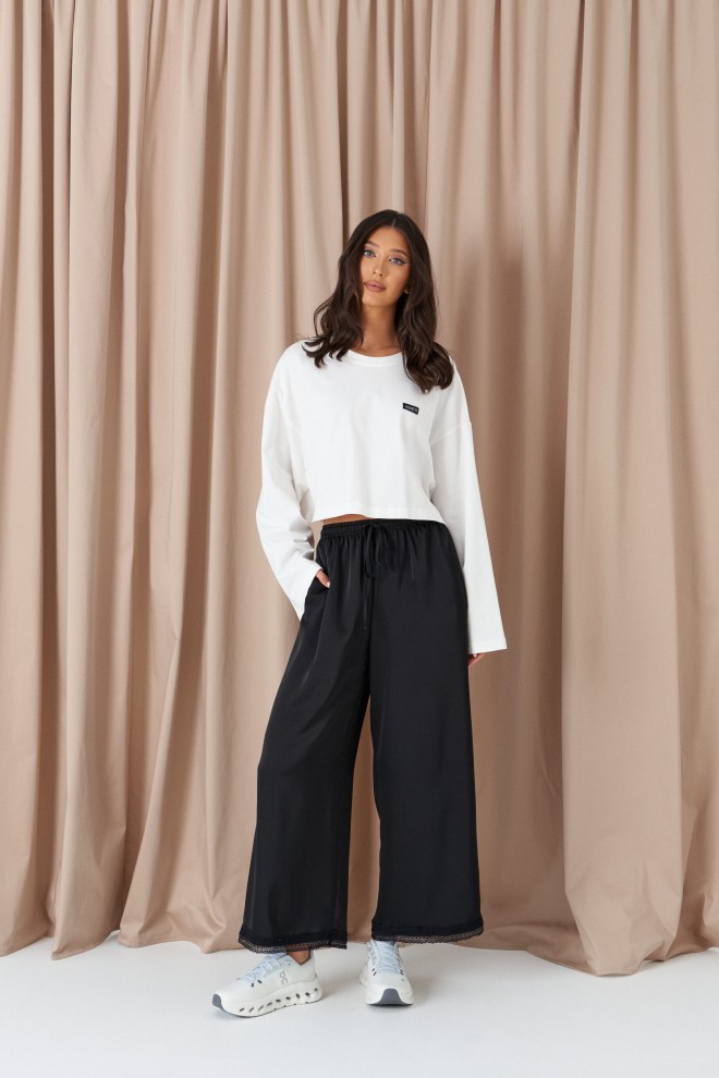 Брюки выполнены из атласной струящейся ткани черного цвета. Характеристики: прямой свободный крой, пояс на кулиске , в боковых швах карманы, декоративное кружево по низу изделия. Длина брюк 97 см.