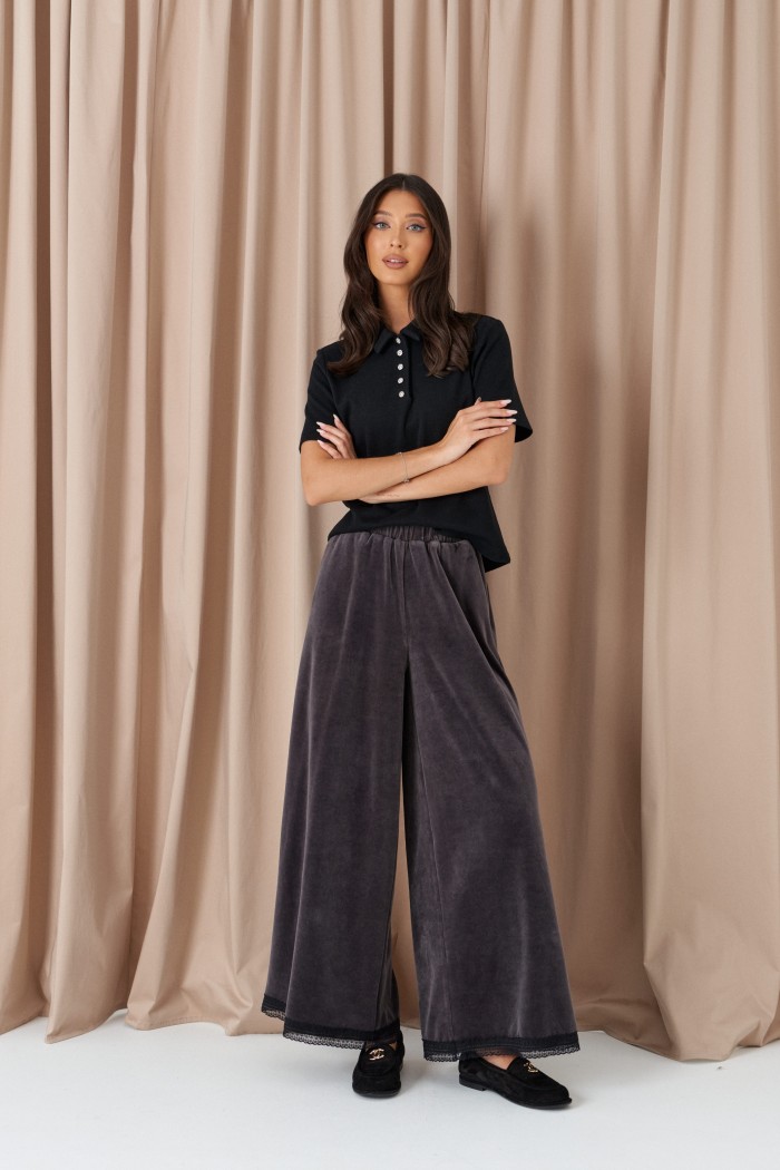 Брюки свободного кроя, выполнены из мягко полотна велюра графитового цвета. Характеристика: свободный корой, пояс на резинке, по низу брюк черное кружево. Длина брюк по боковому шву с учётом кружева 101 см.