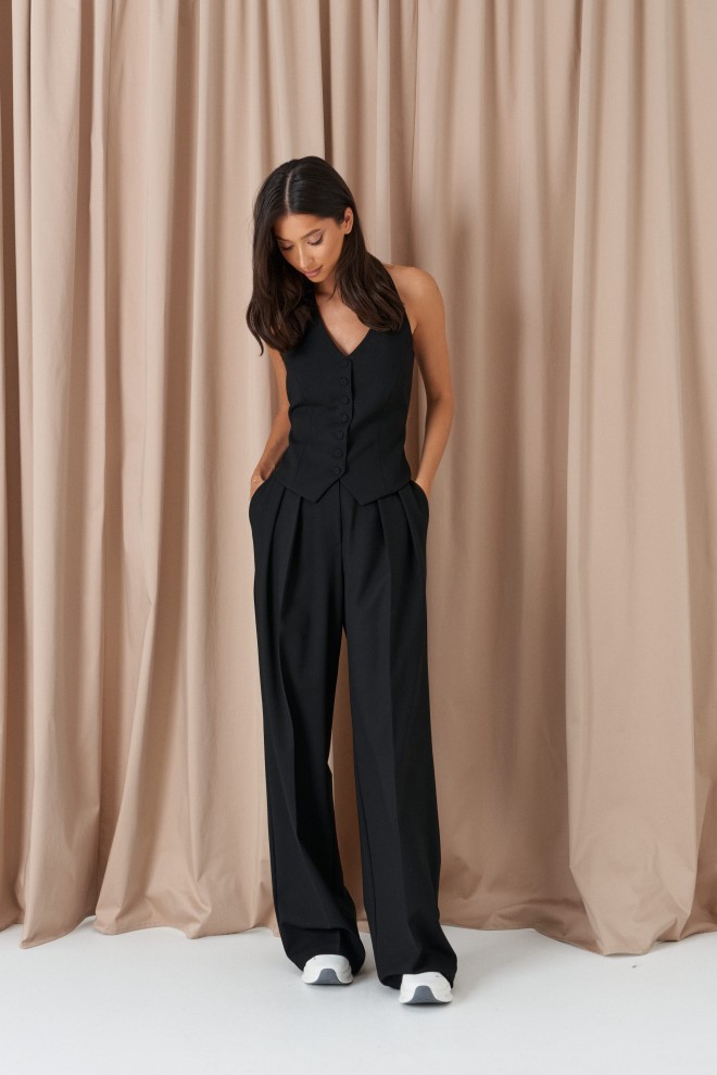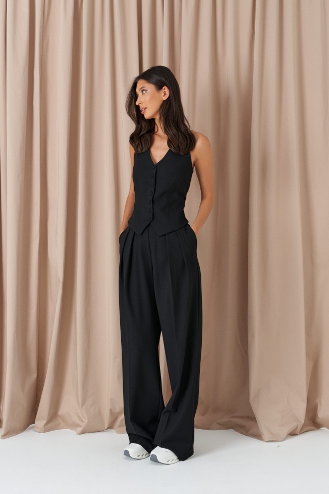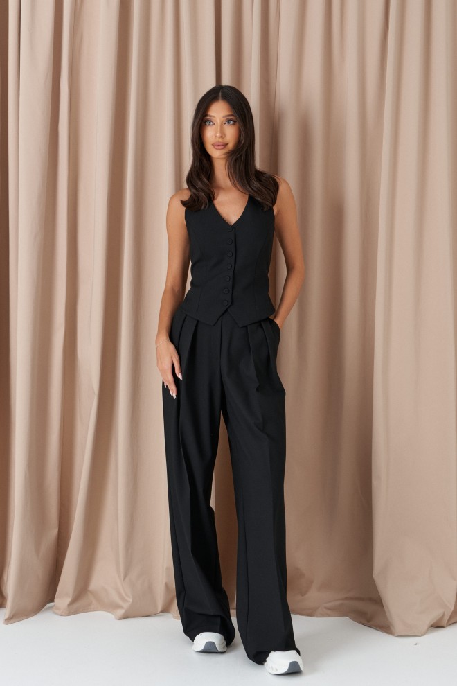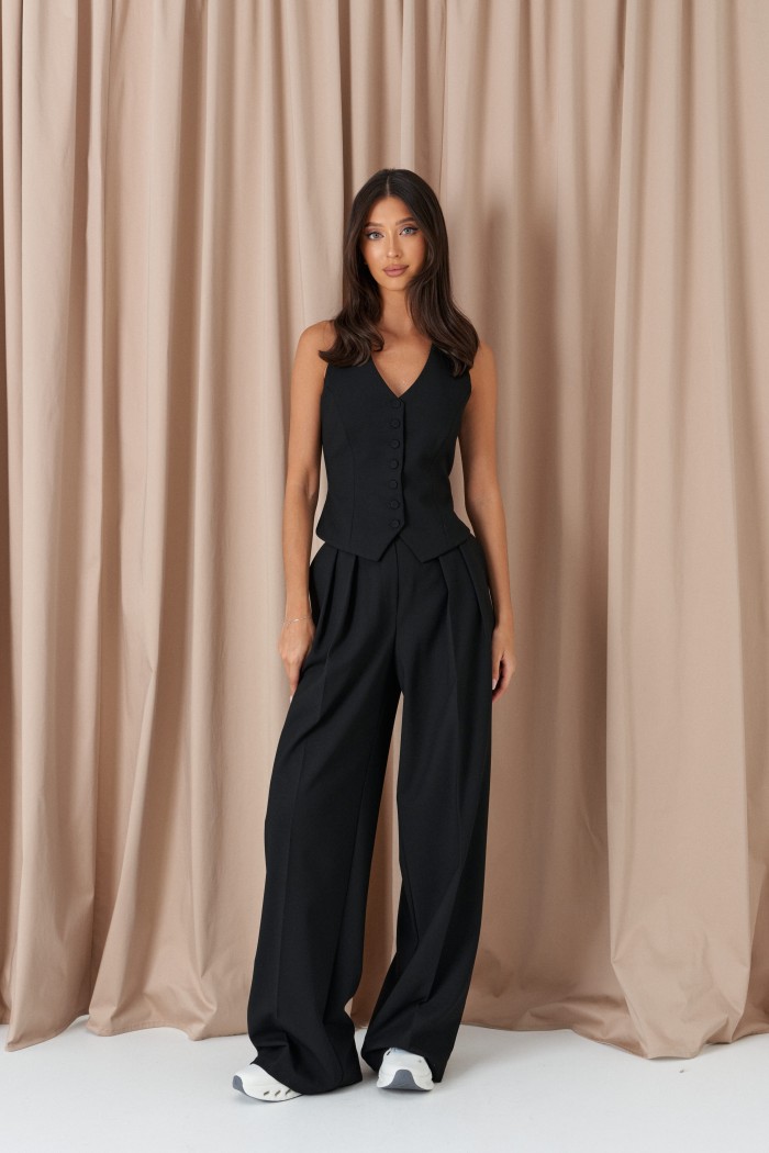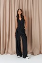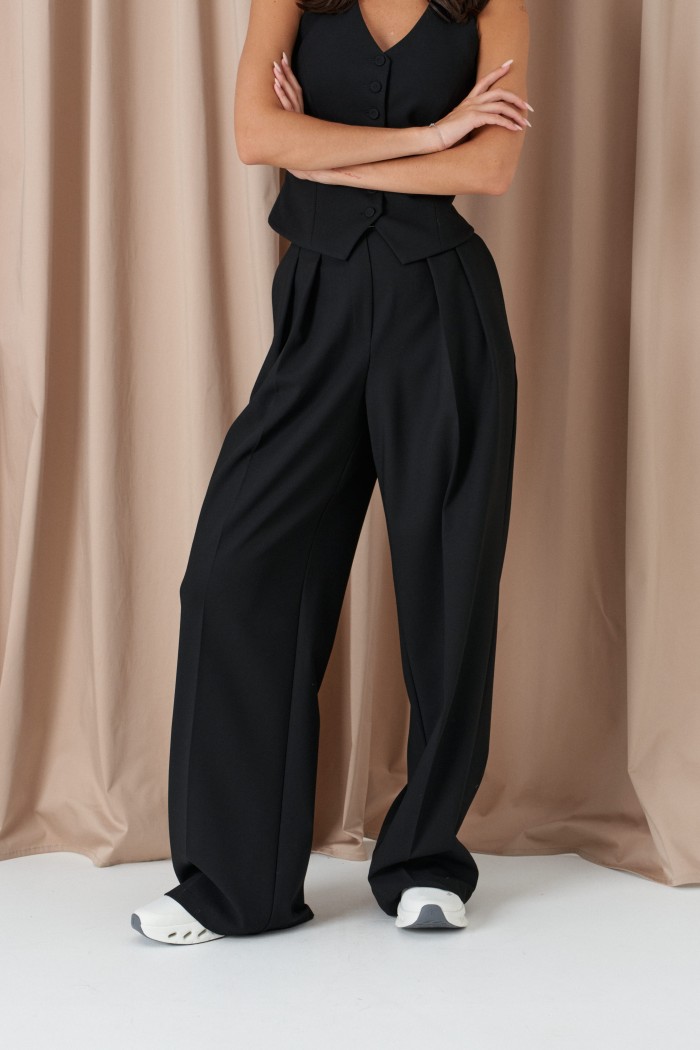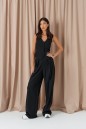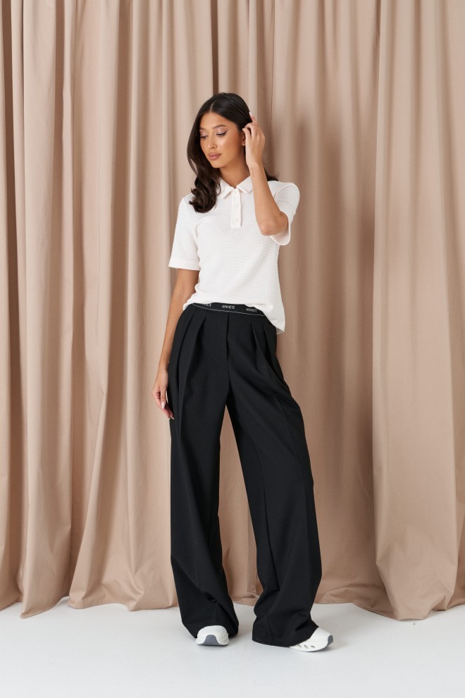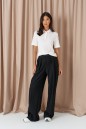 Брюки прямого кроя выполнены из костюмной ткани черного цвета. Характеристики: прямой крой, эластичная брендированная резинка, боковые карманы, на передних и задних частях брюк застрочены складки и заутюжены стрелки. Длина брюк 114 см.