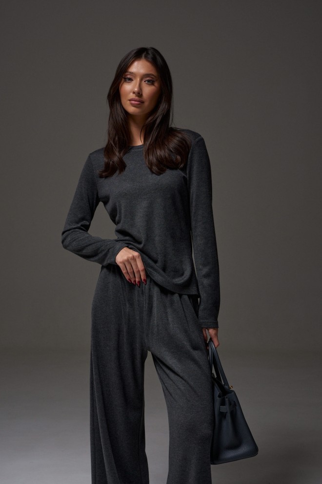 Брюки прямого, свободного кроя выполнены из трикотажного полотна графитового цвета. Характеристики: прямой крой, пояс на резинке, в боковых швах карманы. Длина брюк 107 см.
