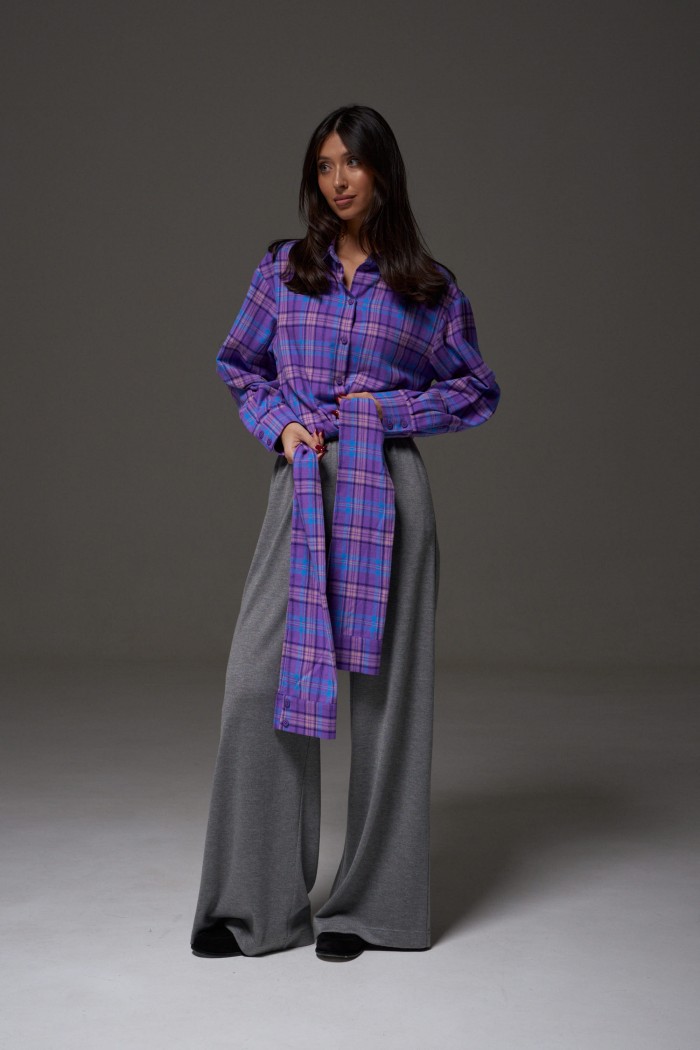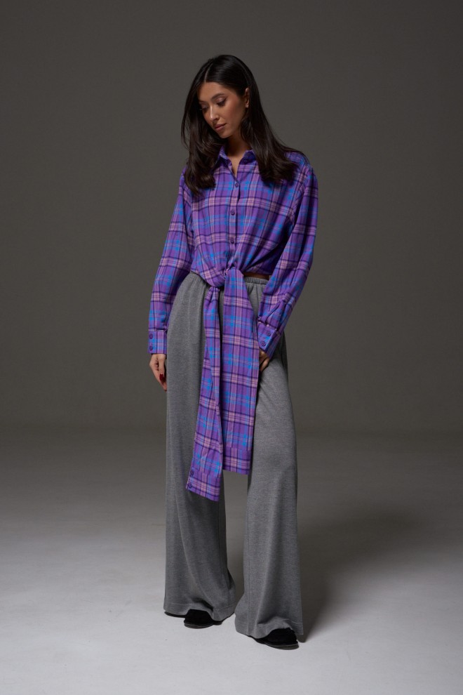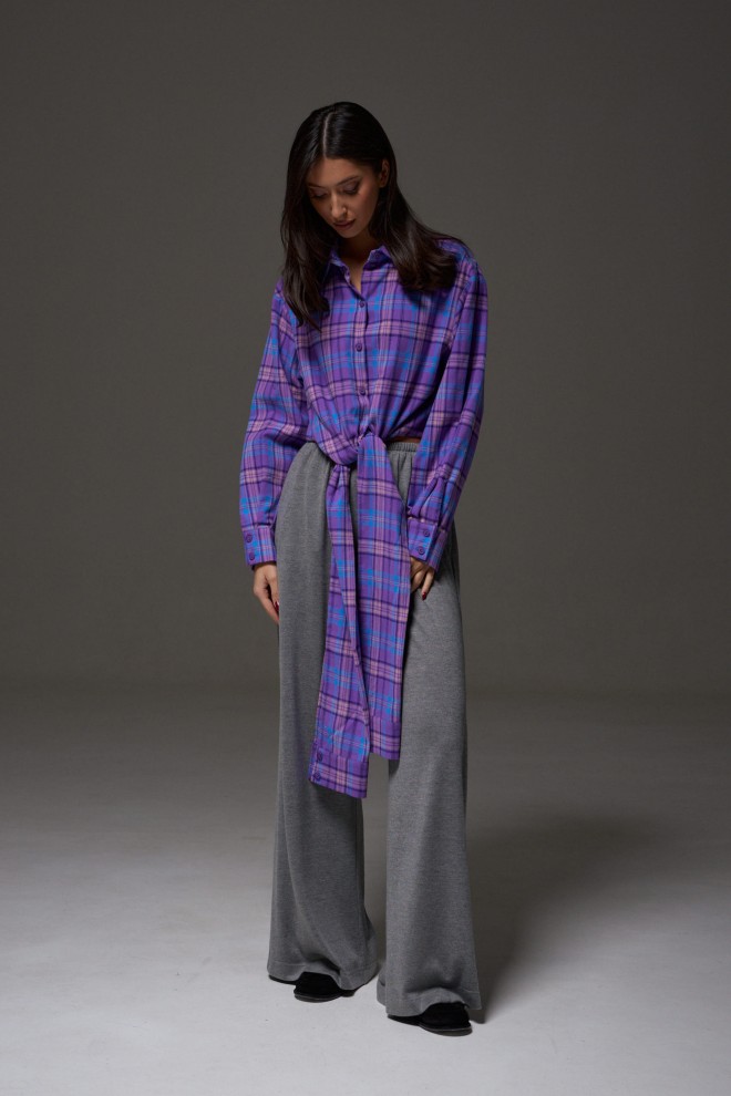 Брюки прямого, свободного кроя выполнены из трикотажного полотна серого цвета. Характеристики: прямой крой, пояс на резинке, в боковых швах карманы. Длина брюк 107 см.