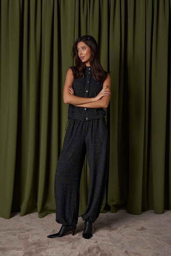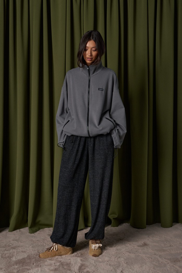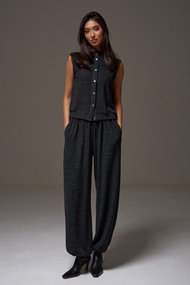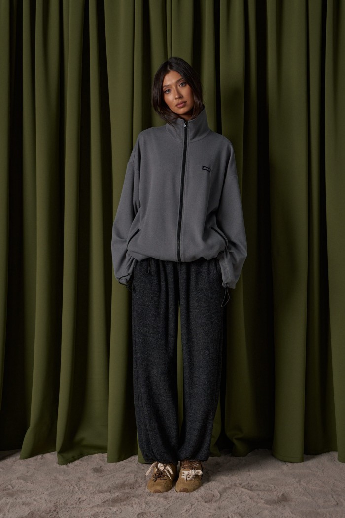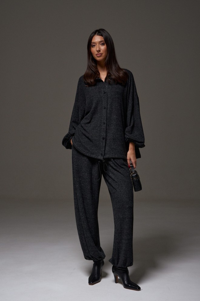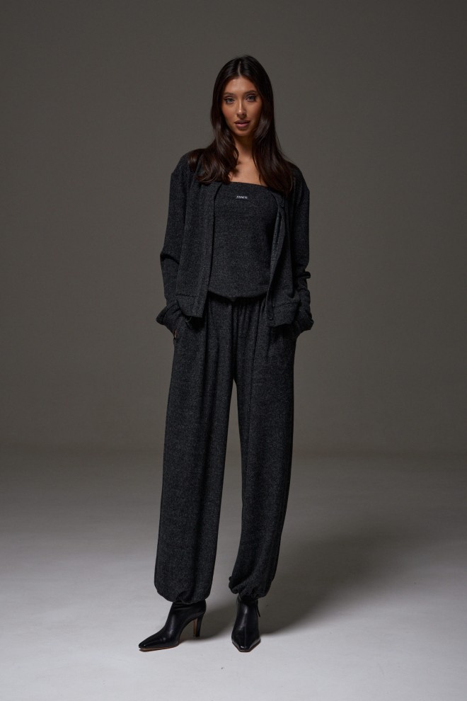 Брюки-джоггеры. Выполнены из мягкого ворсистого трикотажного полотна темно-серого цвета. Характеристики: прямой крой, пояс на шнурке-резинке с фиксатором, в боковых швах карманы, штанина внизу на резинке с фиксатором. Длина 1073см.