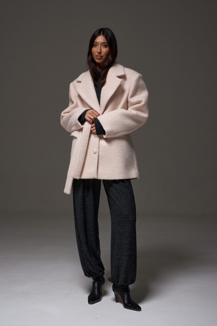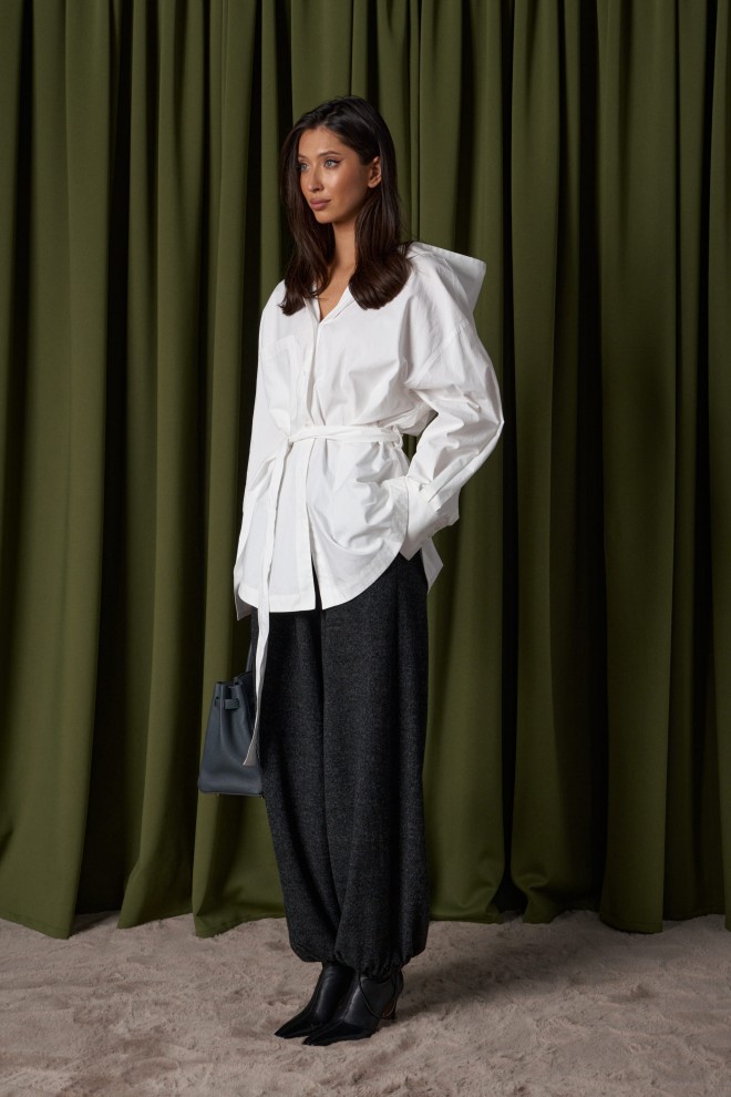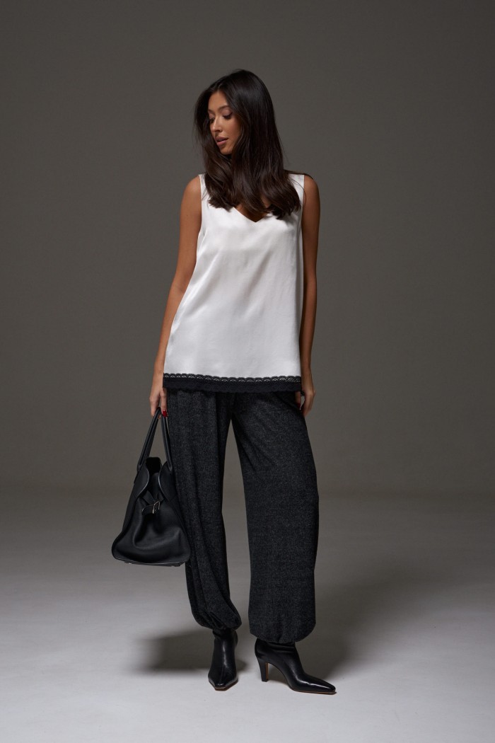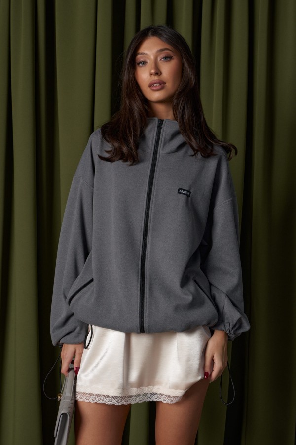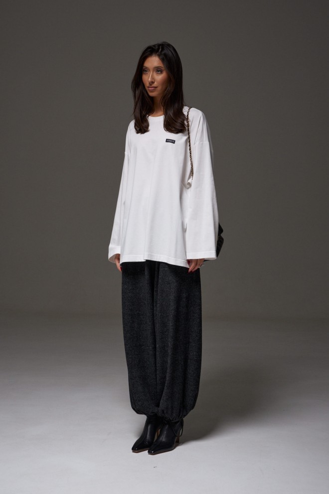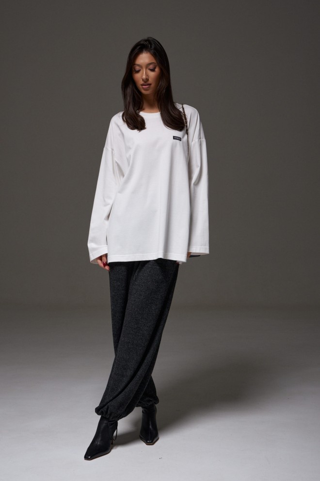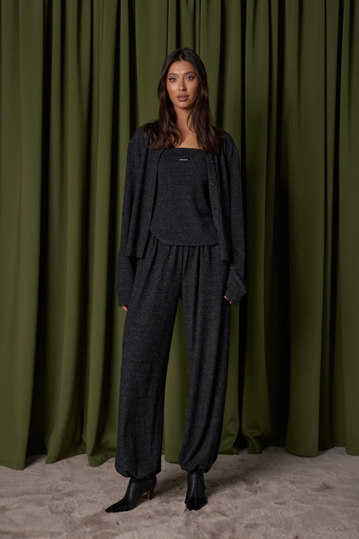 Брюки-джоггеры. Выполнены из мягкого ворсистого трикотажного полотна темно-серого цвета. Характеристики: прямой крой, пояс на шнурке-резинке с фиксатором, в боковых швах карманы, штанина внизу на резинке с фиксатором. Длина 1073см.