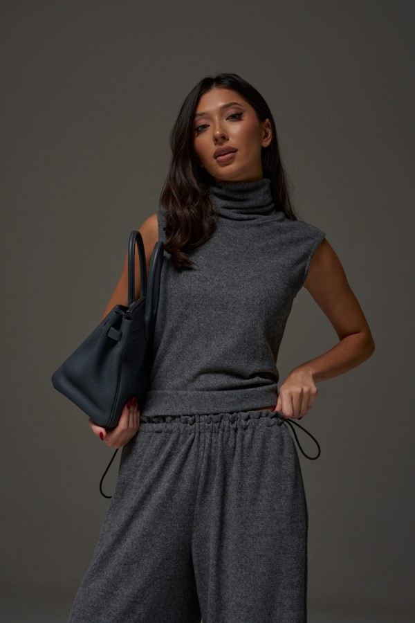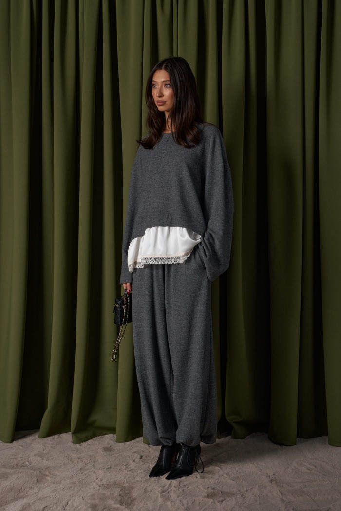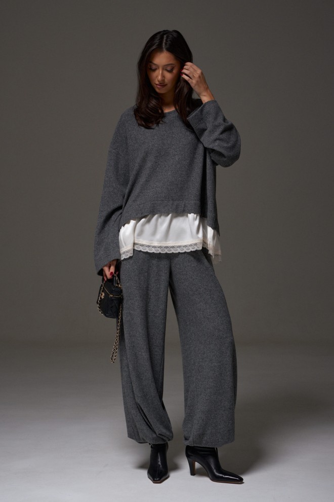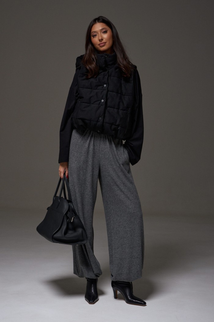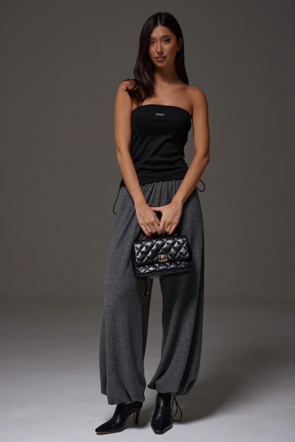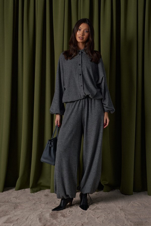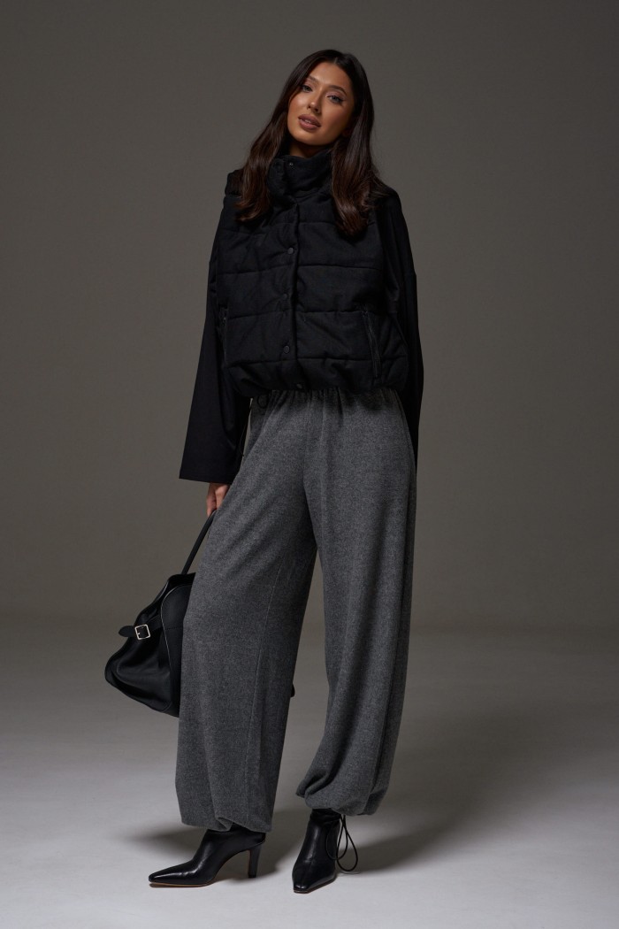 Брюки-джоггеры. Выполнены из мягкого ворсистого трикотажного полотна серого цвета. Характеристики: прямой крой, пояс на шнурке-резинке с фиксатором, в боковых швах карманы, штанина внизу на резинке с фиксатором. Длина 110 см.