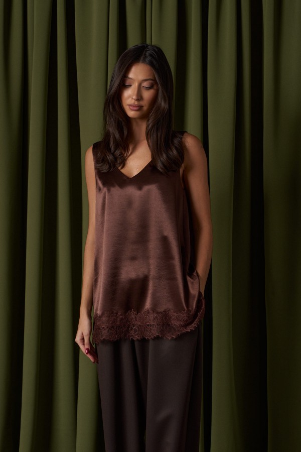 Брюки свободного кроя. Выполнены из плотной текстильной ткани шоколадного цвета. Пояс на резинке. Застёжки нет. В боковых швах карманы. Низ брючины на резинке с фиксатором (регулируется). Длина брюк 100 см
