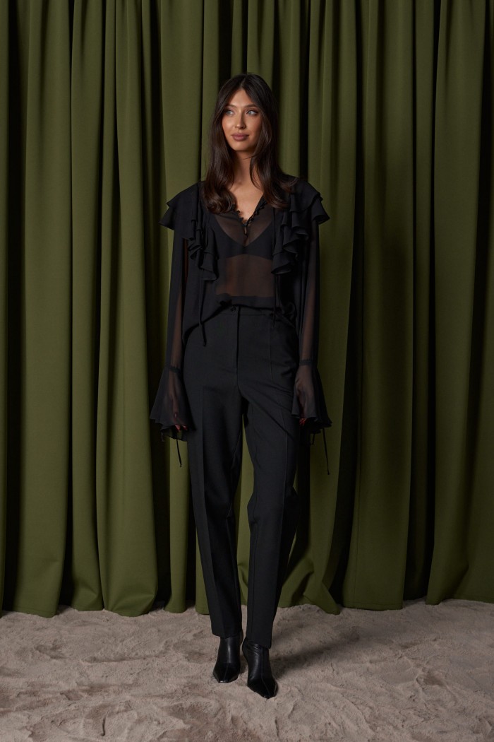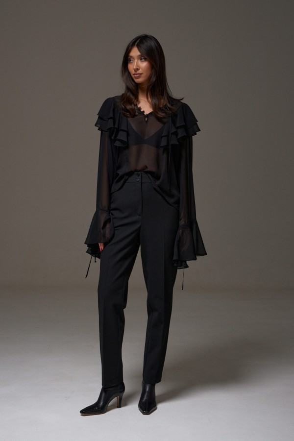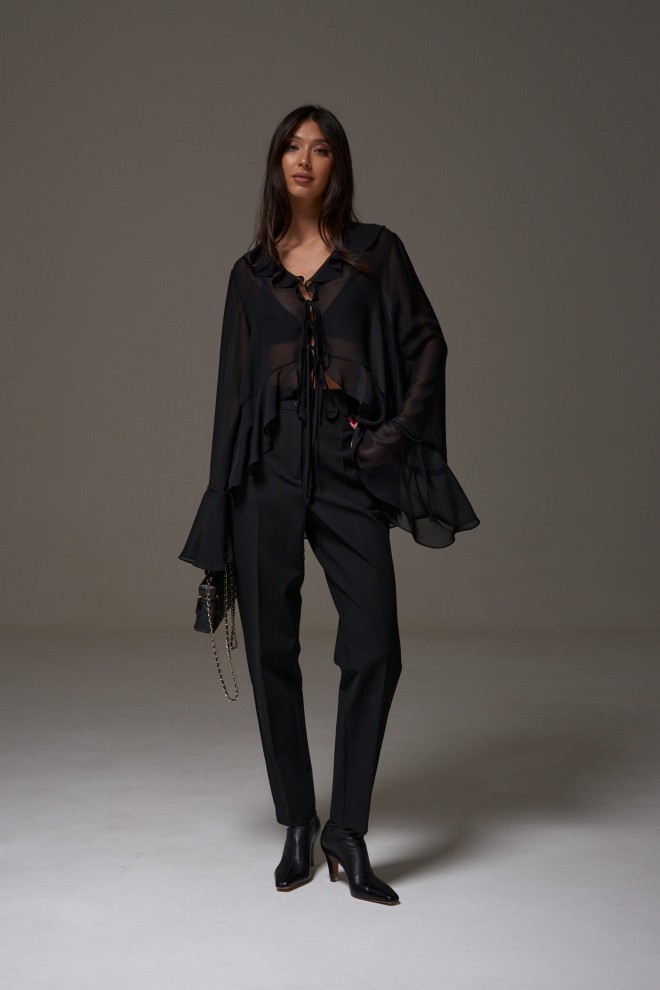 Брюки выполнены из текстильного полотна черного цвета. Характеристики: зауженные к низу, пояс стабильный, по поясу нашиты шлевки, застежка на две пуговицы и молнию, в боковых швах карманы. Длина 105 см.