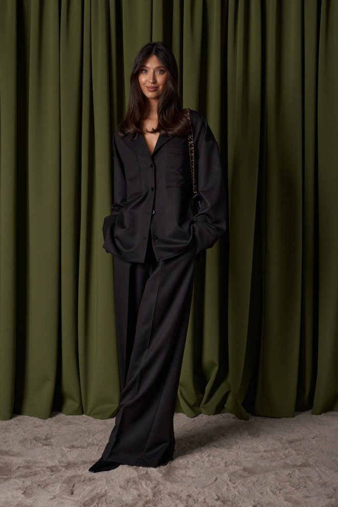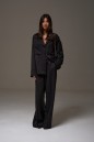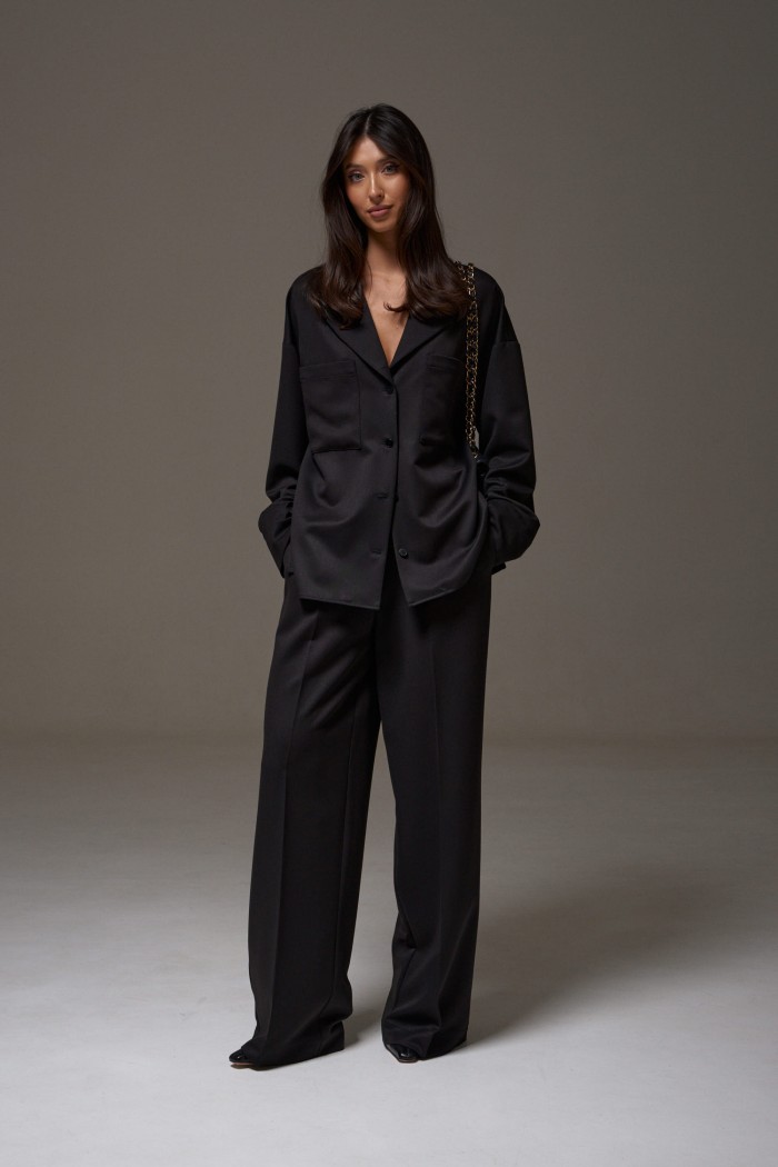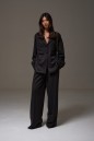 Брюки прямого кроя, выполнены из костюмной ткани черного цвета. В боковых швах карманы с отрезным бочком. Пояс на резинке. По переду изделия имитация застёжки с пришитыми пуговицами. По передней и задней части брюк заутюженные стрелки. Длина 108 см