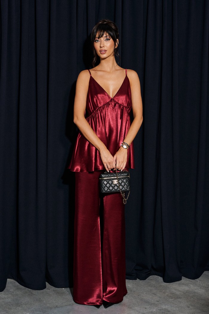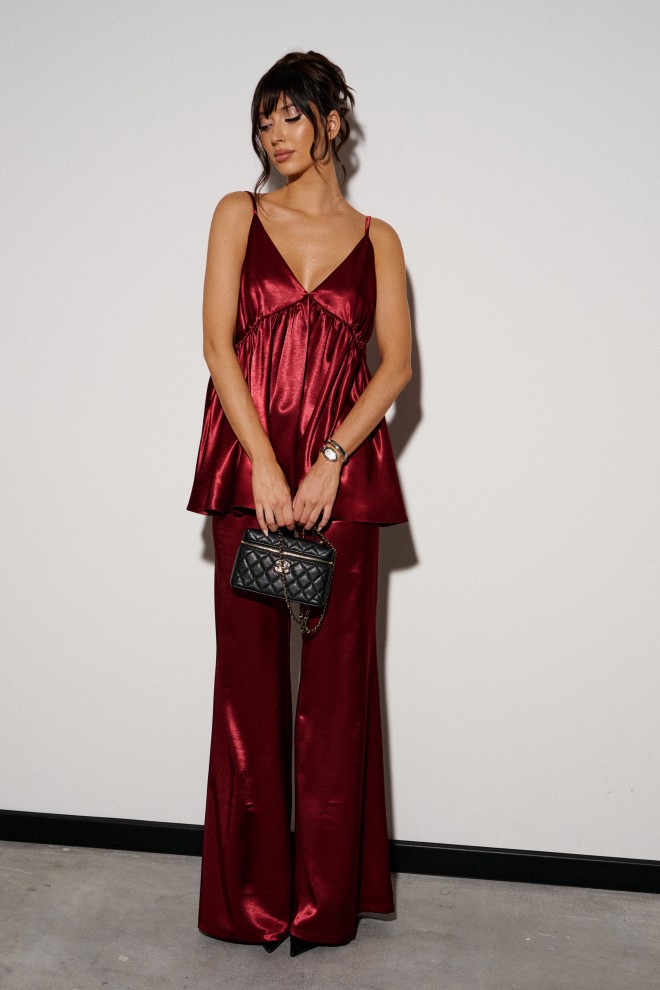 Брюки прямого свободного кроя. Выполнены из мягкой струящейся ткани бордового цвета. Пояс на резинке. Карманов нет. Длина 109 см
