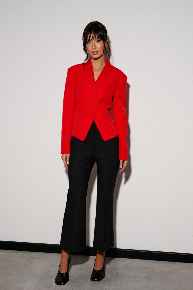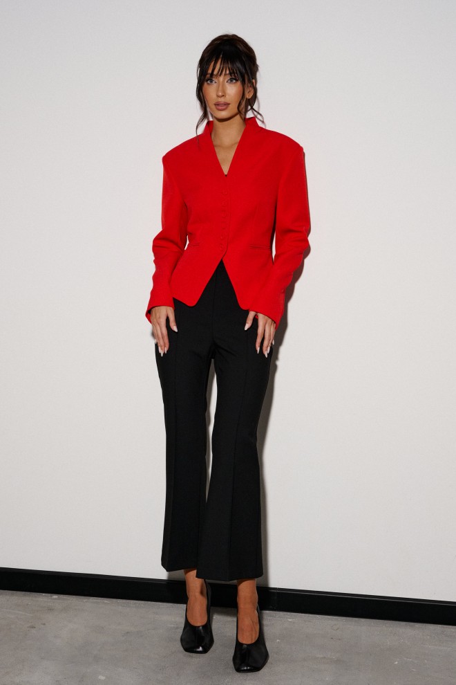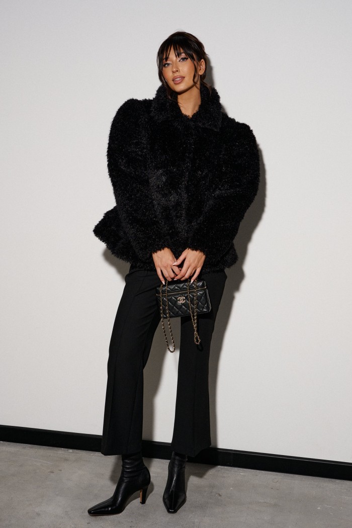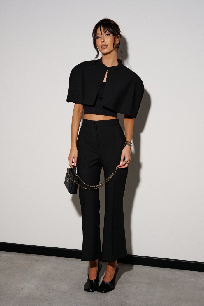 Брюки-клёш укороченные. Выполнены из костюмной ткани чёрного цвета. Пояс стабильный. Застежка центральная - молния и пуговица. По передней и задней часть стрелки (застроченные). В боковых шва имитация карманов. По задней части брюк имитация карманов в виде карманной листочки. Длина по боковому шву 96 см