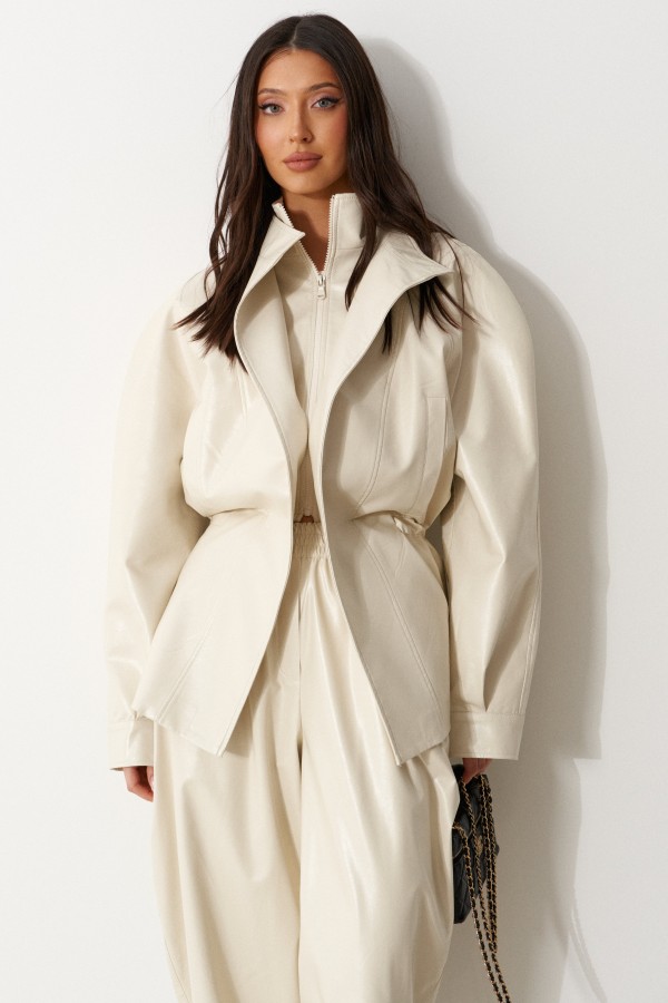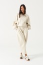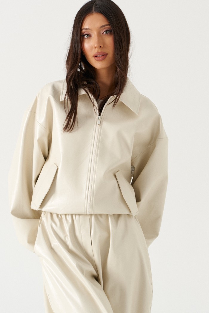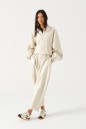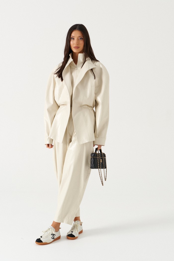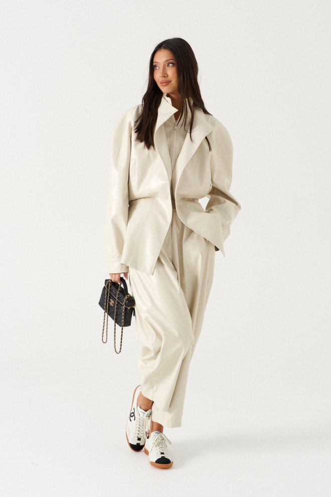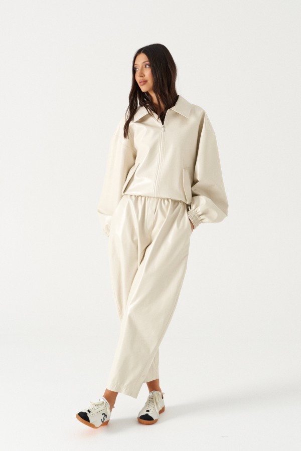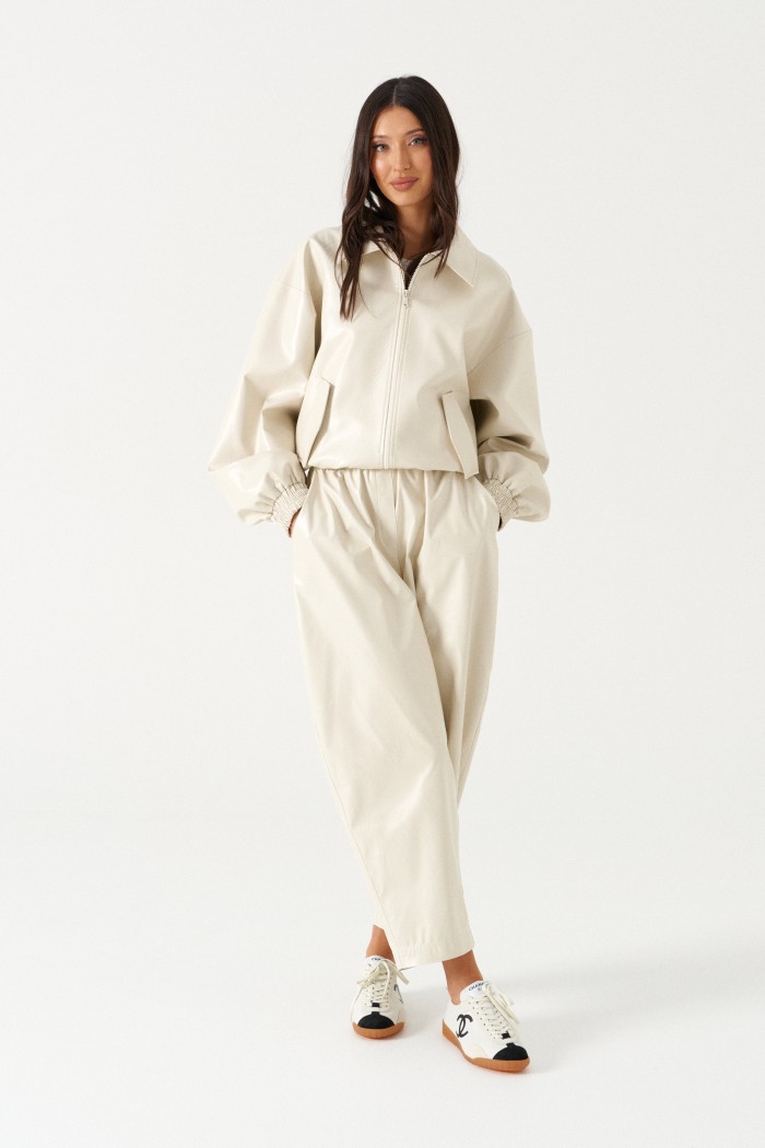 Брюки свободного кроя зауженные к низу, выполненные из эко-кожи имолочного цвета. Характеристика: свободный крой, брючины заужаются к низу, пояс на резинке, имитация гульфика, в боковых швах карманы. Длина по боковому шву 97см.
