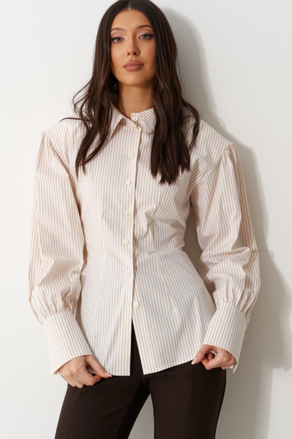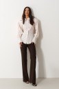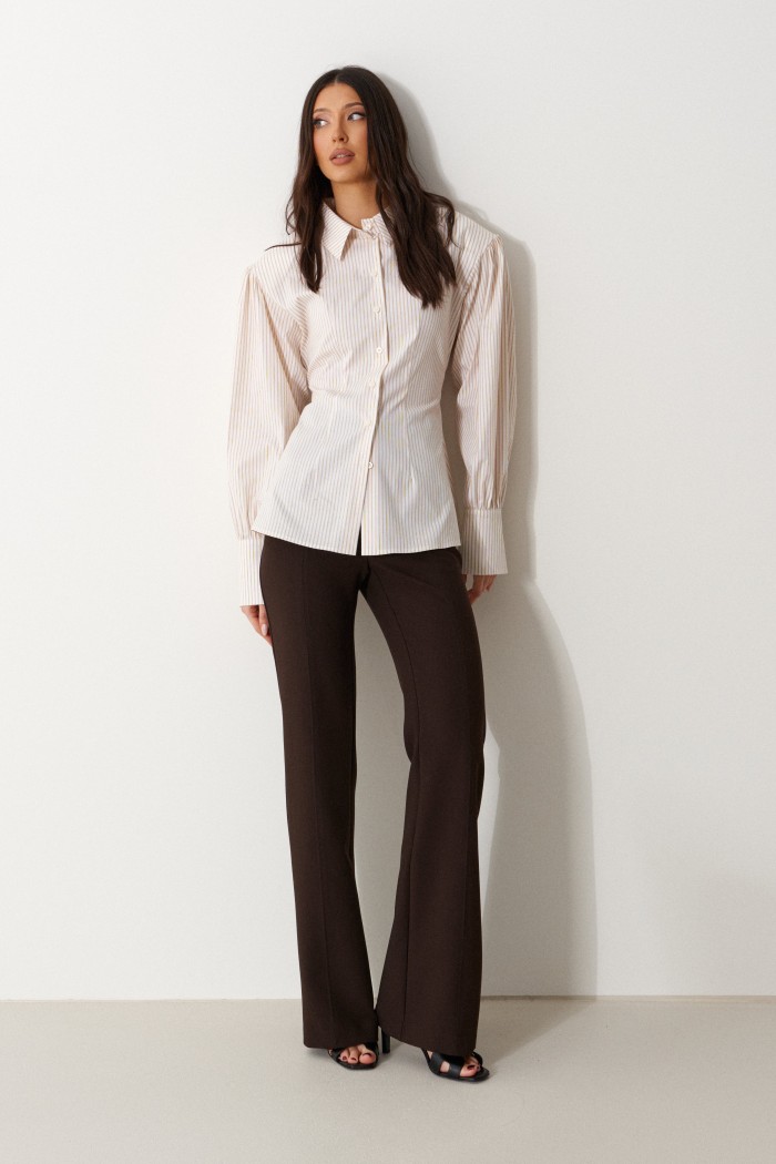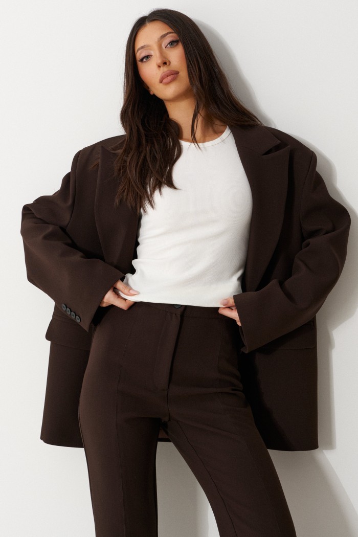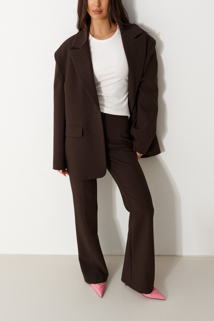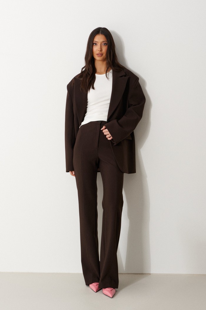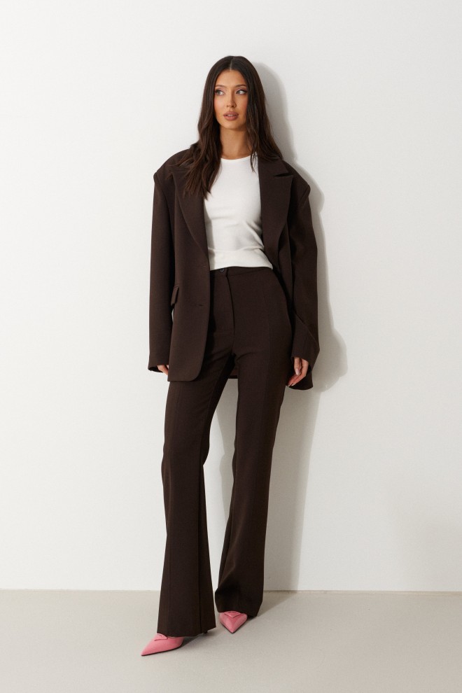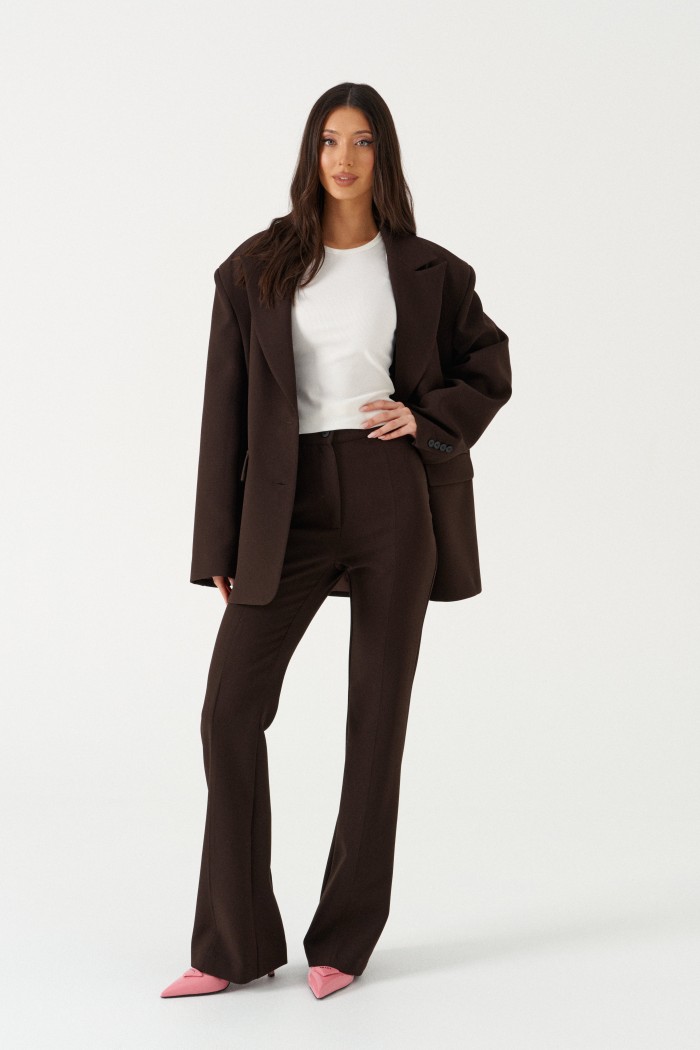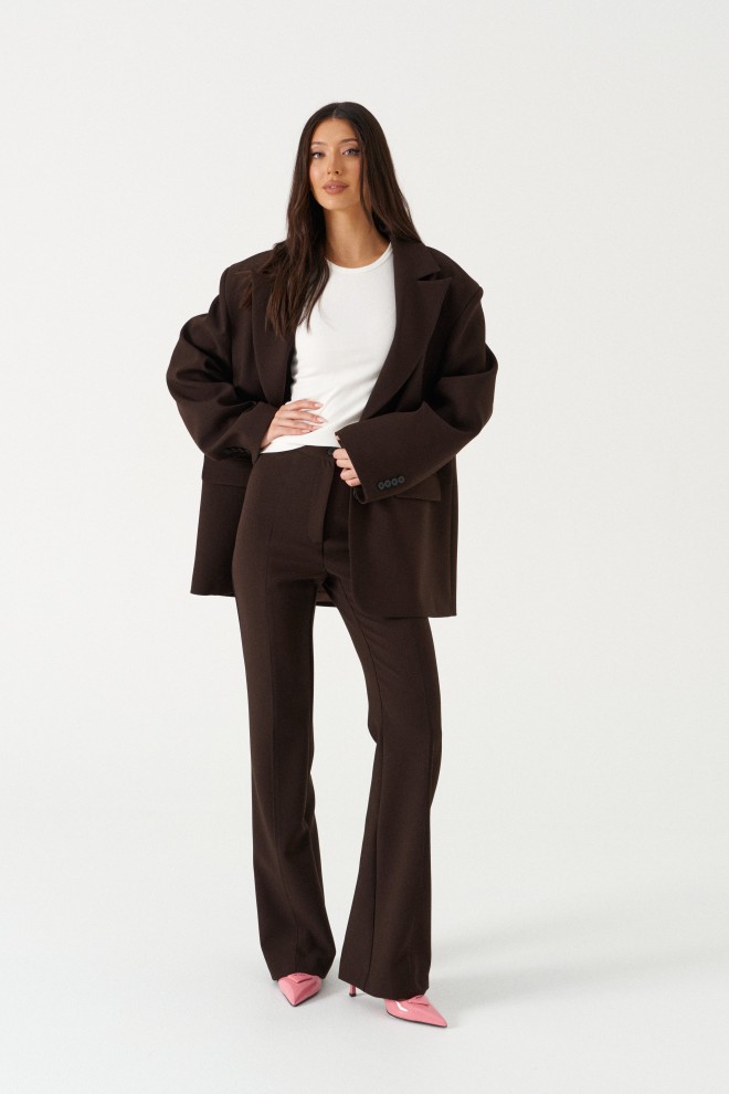 Брюки женские облегающего силуэта, расклешенные к низу, выполнены из костюмной ткани коричневого цвета. Характеристика: на задних частях брюк обработаны карманы в рамку с листочкой, обработаны таллиевые вытачки и заутюжены и отстрочены стрелки. Передняя часть брюк состоит из двух деталей с центральным швом по линии стрелки и отделочными строчками. Застежка молния брючного типа с гульфиком и откоском. Пояс стабильный застегивающийся на петлю, пуговицу. Длина брюк по боковому шву 114 см.