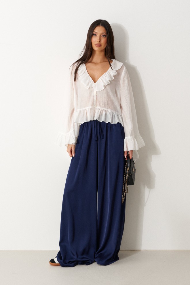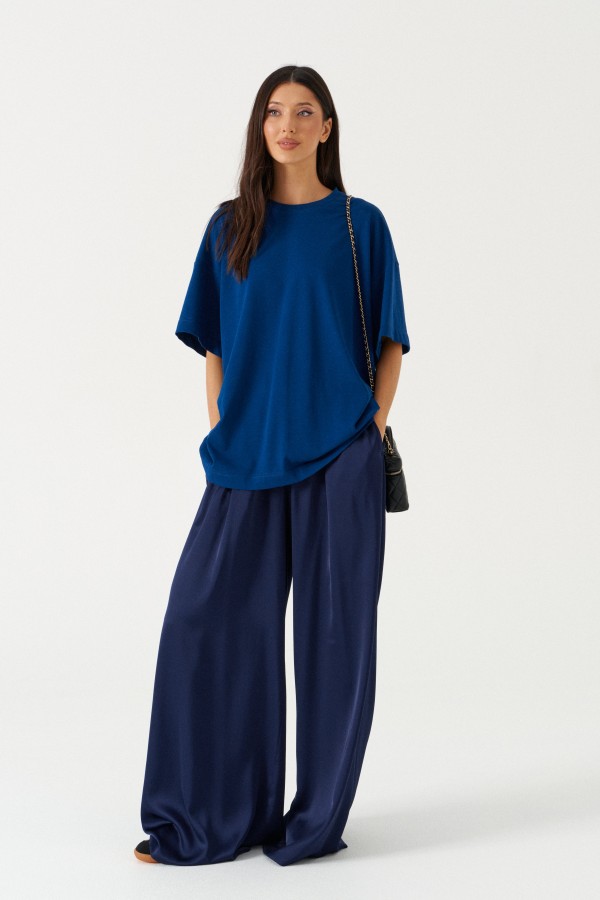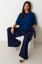 Брюки свободного кроя. Выполнены из мягкой струящейся ткани синего цвета. Пояс на резинке, со шнурочком. В боковых швах карманы. Длина бокового шва (с учётом пояса) 107 см