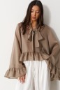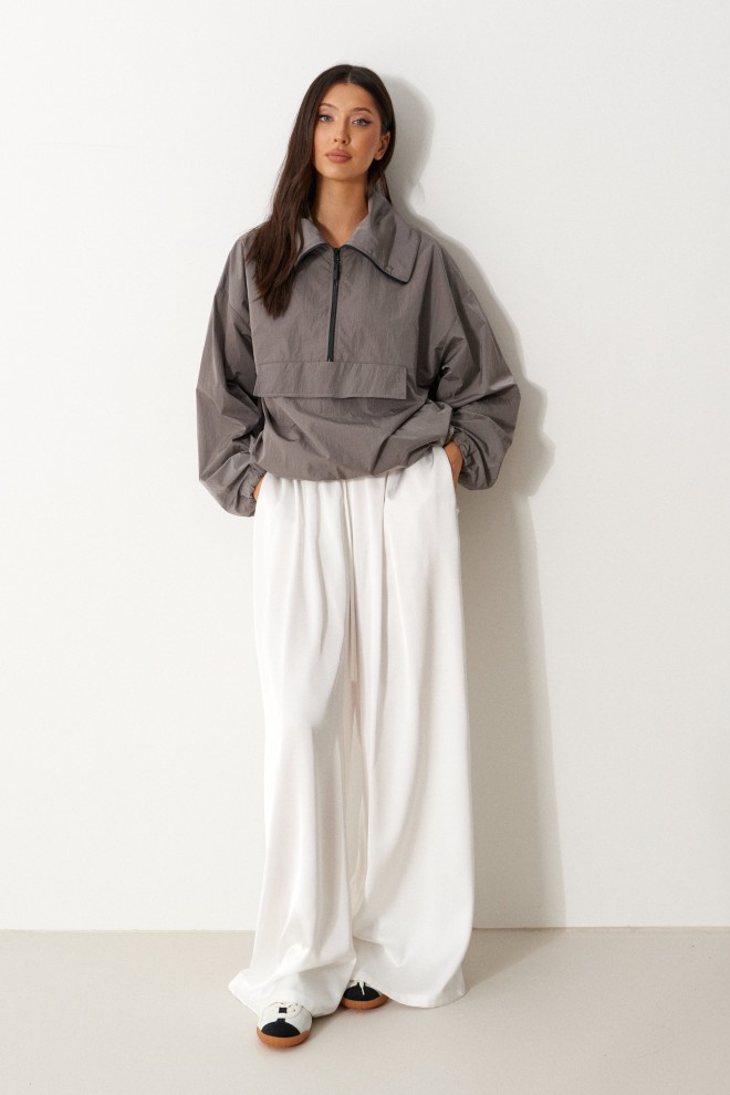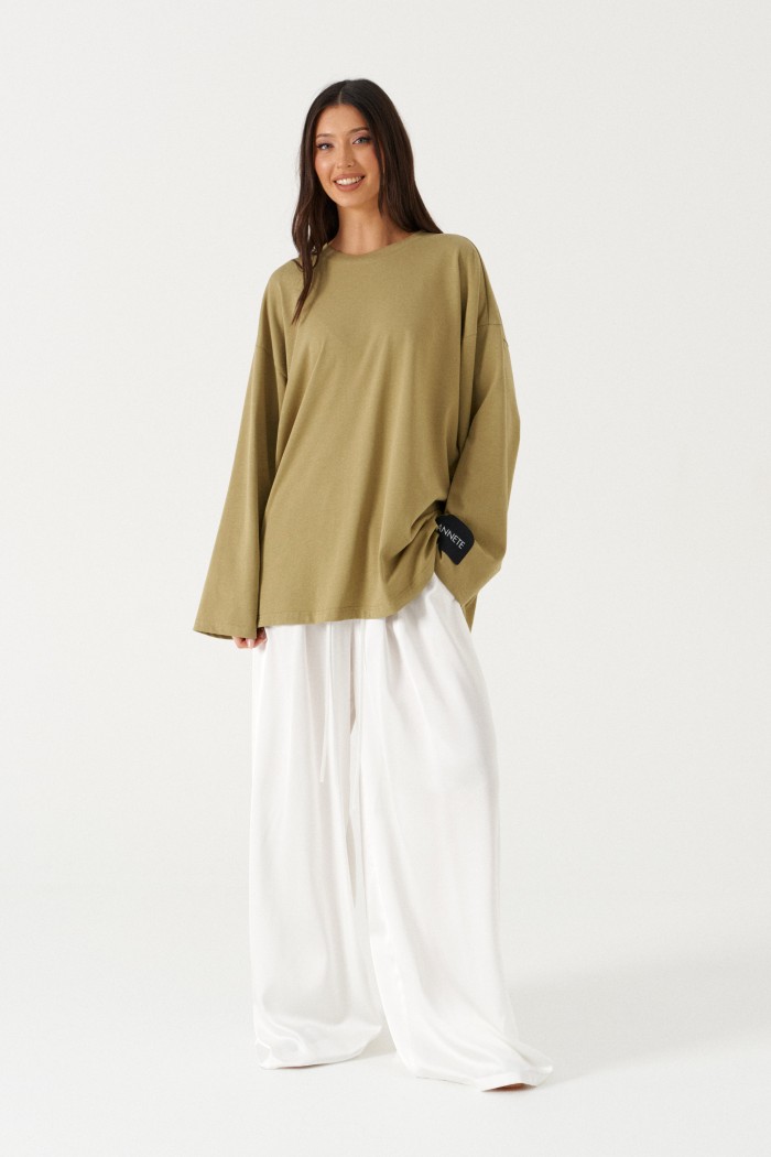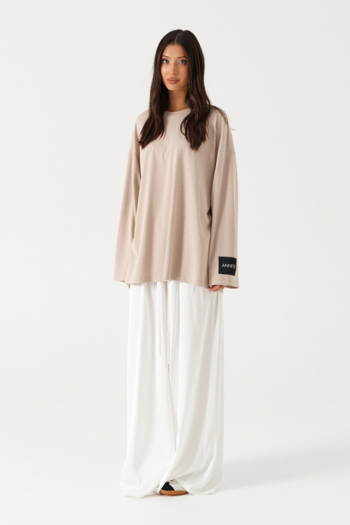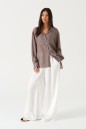 Брюки свободного кроя. Выполнены из мягкой струящейся ткани белого цвета. Пояс на резинке, со шнурочком. В боковых швах карманы. Длина бокового шва (с учётом пояса) 107 см