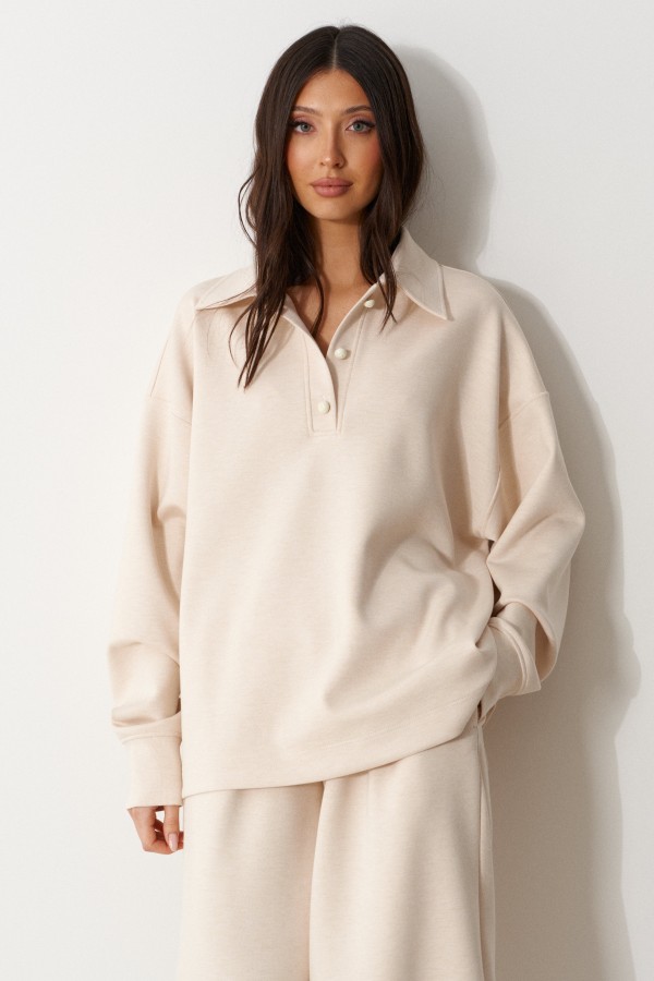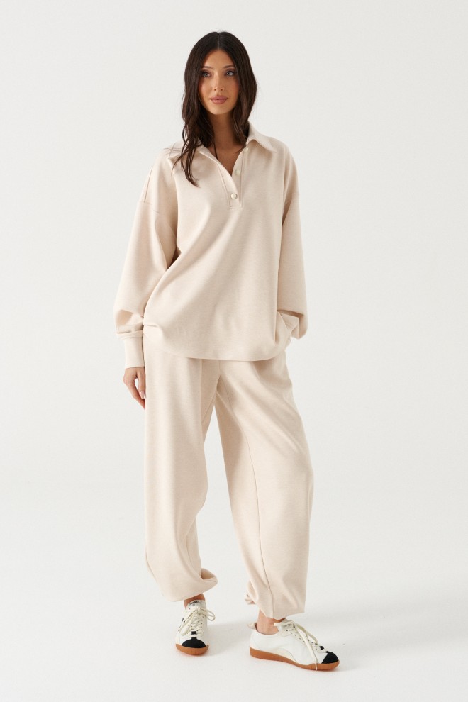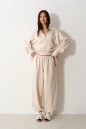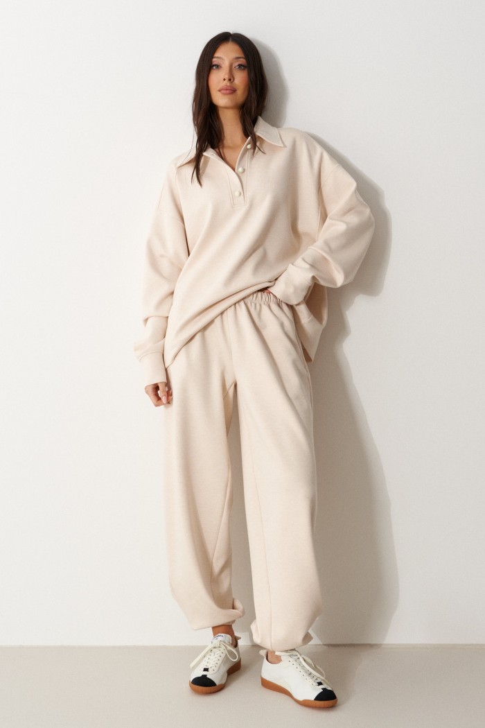 Брюки выполнены из трикотажного полотна молочного цвета. Характеристики: прямой крой, пояс на резинке с кулиской, в боковых швах карманы, накладные карманы на задней части брюк, штанина внизу на резинке с фиксатором. Длина по боковому шву 100 см.