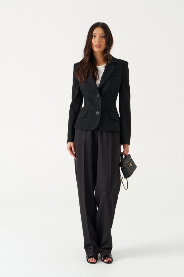 Брюки прямого совбодного кроя, выполнены из костюмной тонкой ткани черного цвета. Характеристика: прямой крой, пояс на резинке, в боковых швах карманы, имитация гульфика, заутюженные стреки спереди и сзади, чуть заужаются к низу. Длина по боковому шву 112см.