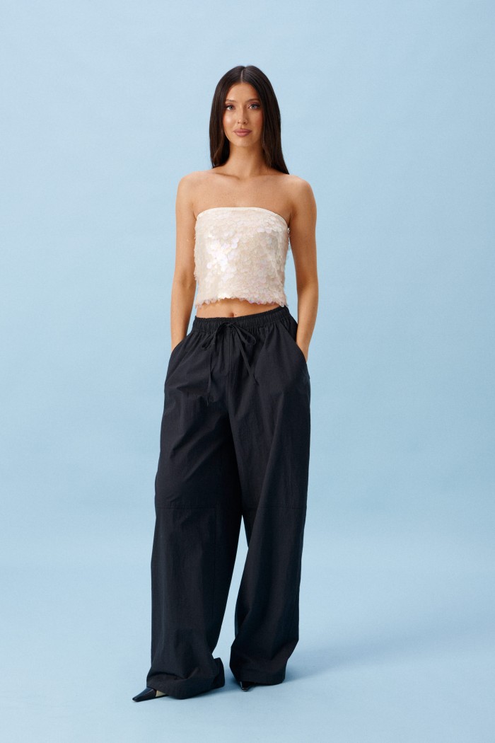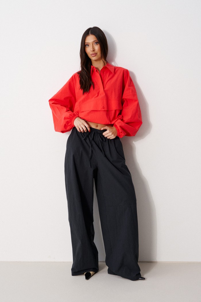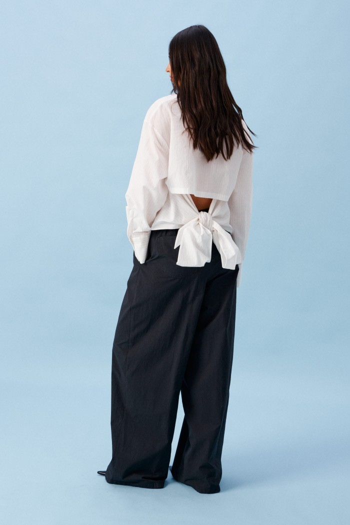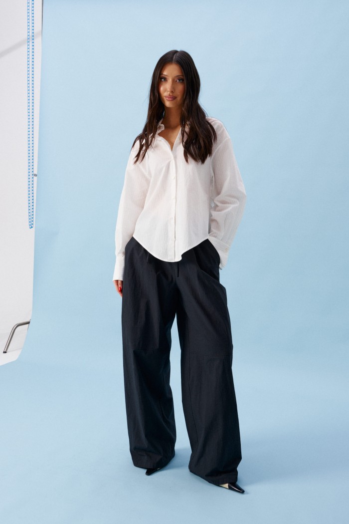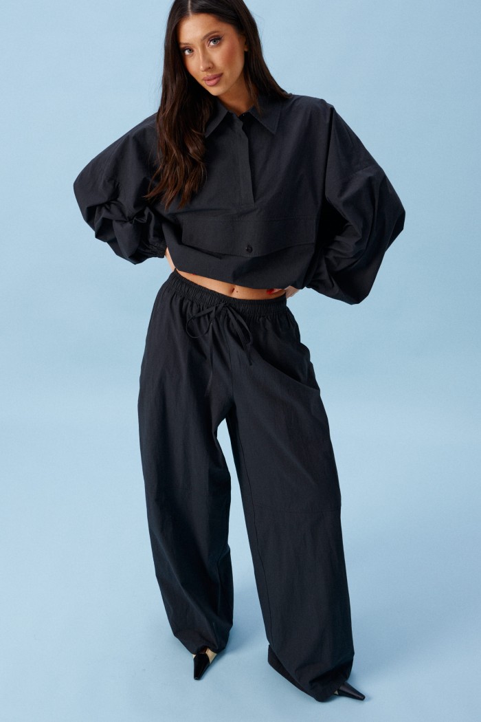Брюки прямого кроя, выполнены из хлопкового полотна черного цвета. Характеристика: свободный крой, пояс на резинке со шнурочком, в боковых швах карманы, сзади изделия накладные функциональные карманы. Передние половины брюк разделены швом с отделочными строчками на уровне середины бедра. Длина по боковому шву 104 см.