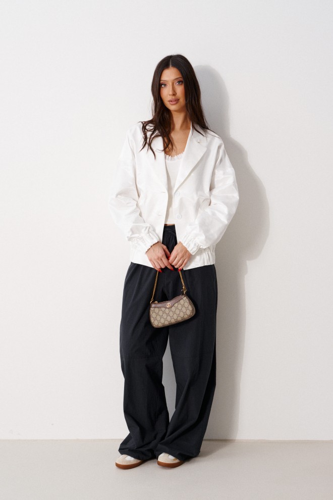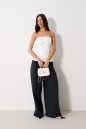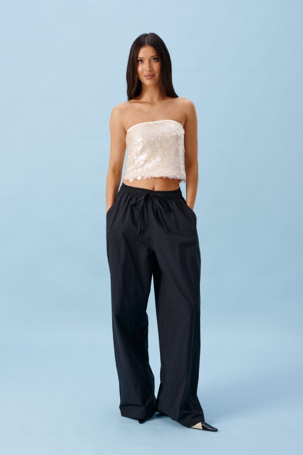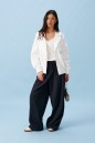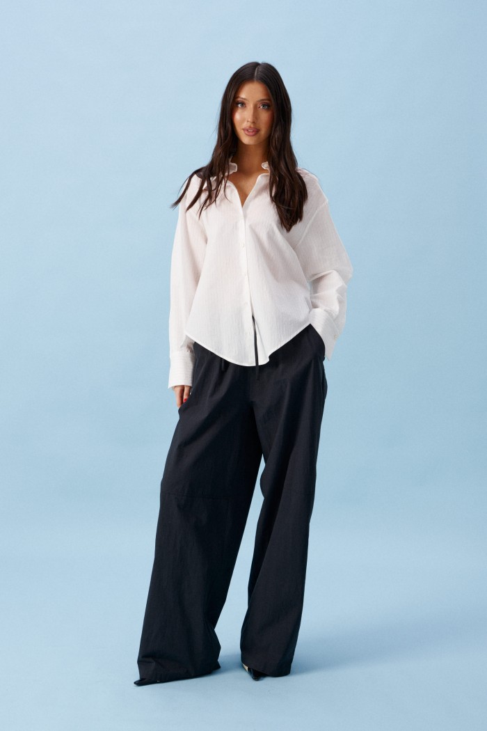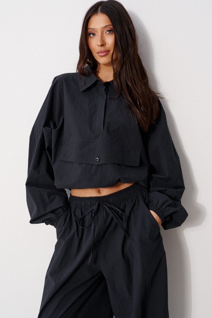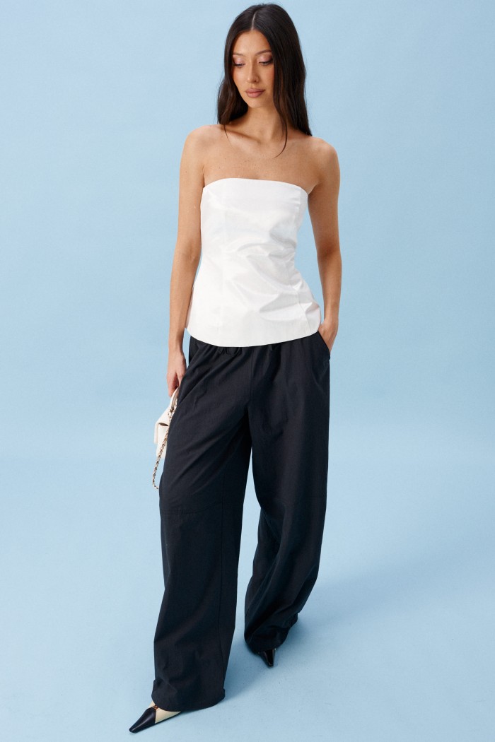 Брюки прямого кроя, выполнены из хлопкового полотна черного цвета. Характеристика: свободный крой, пояс на резинке со шнурочком, в боковых швах карманы, сзади изделия накладные функциональные карманы. Передние половины брюк разделены швом с отделочными строчками на уровне середины бедра. Длина по боковому шву 104 см.