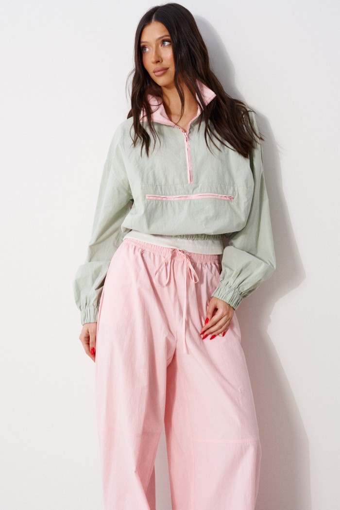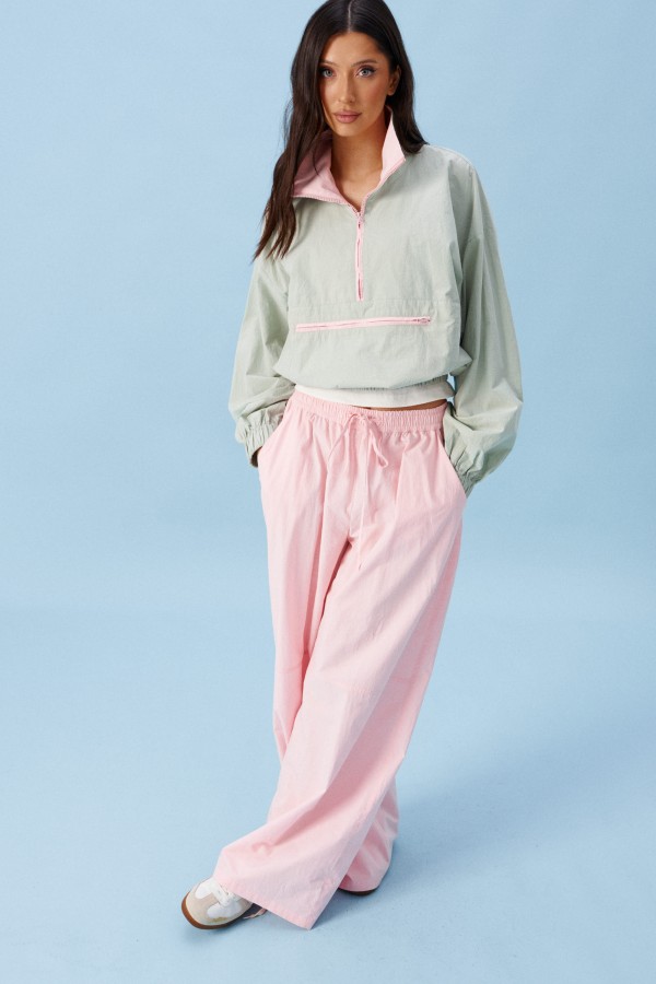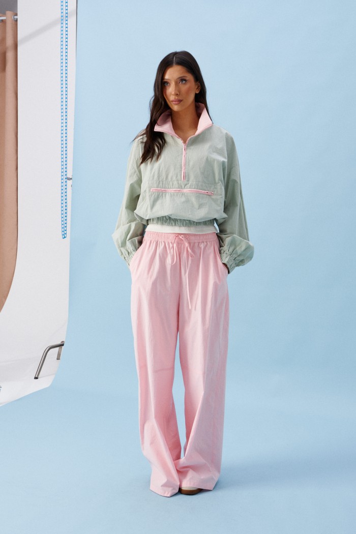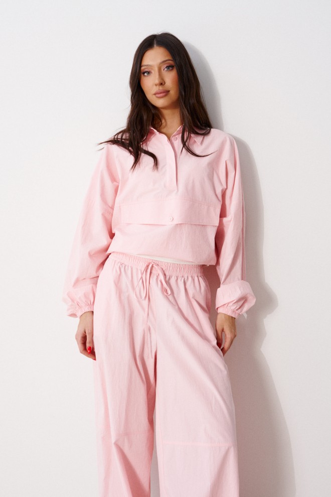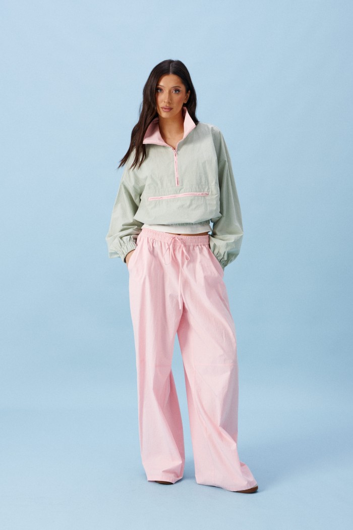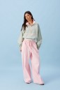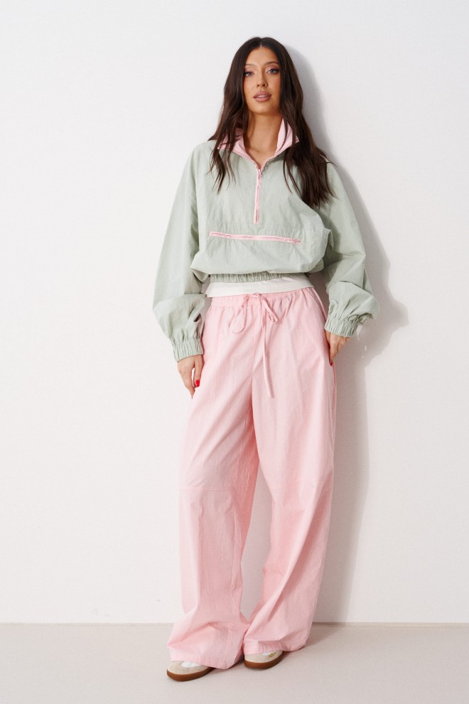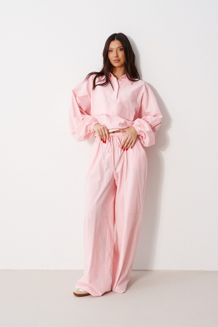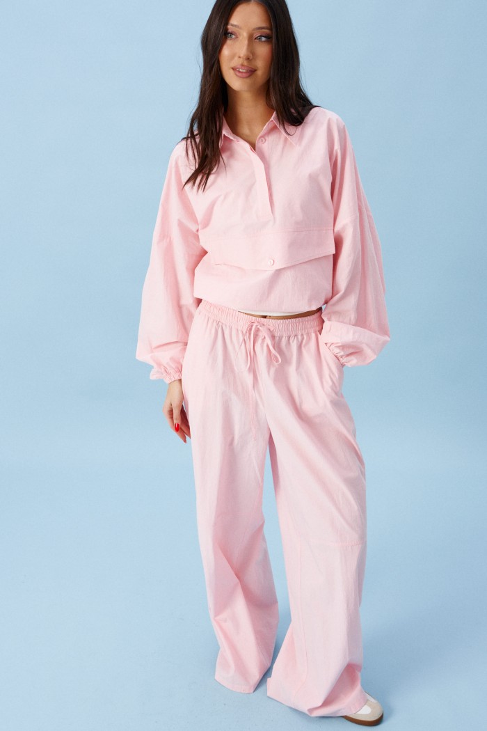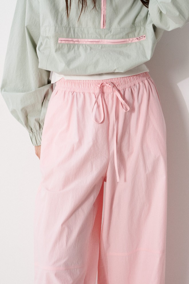 Брюки прямого кроя, выполнены из хлопкового полотна розового цвета. Характеристика: свободный крой, пояс на резинке со шнурочком, в боковых швах карманы, сзади изделия накладные функциональные карманы. Передние половины брюк разделены швом с отделочными строчками на уровне середины бедра. Длина по боковому шву 104 см.