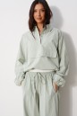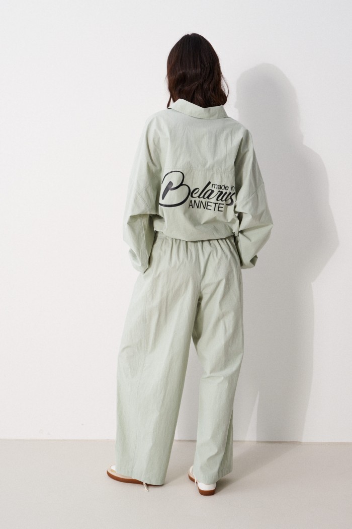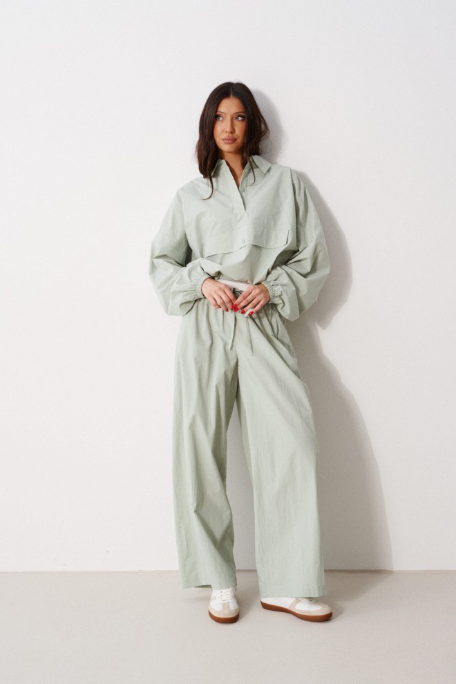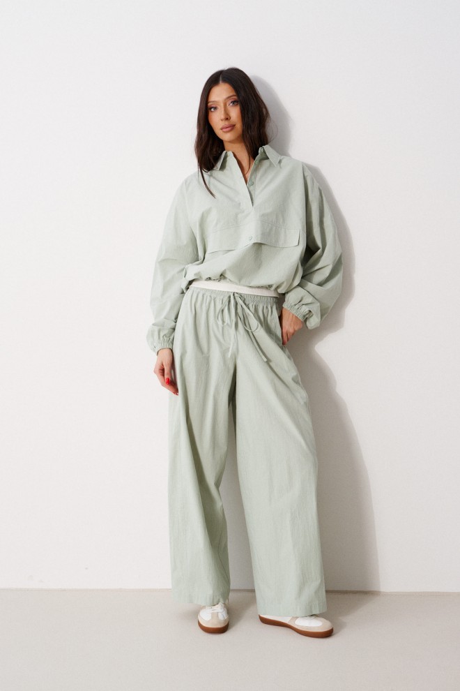 Брюки свободного кроя. Выполнены из хлопковой (смесовой) ткани цвета светлой оливы. Пояс на резинке, с завязками. Есть прорезные карманы. Длина 103 см