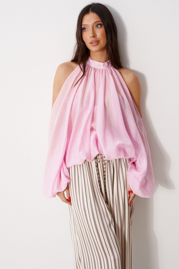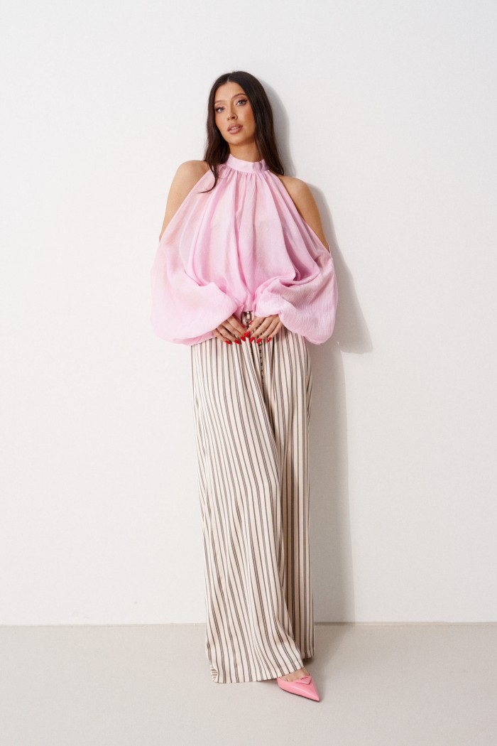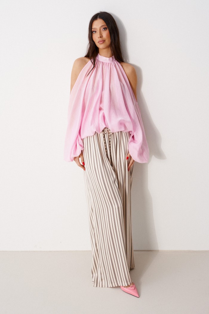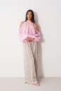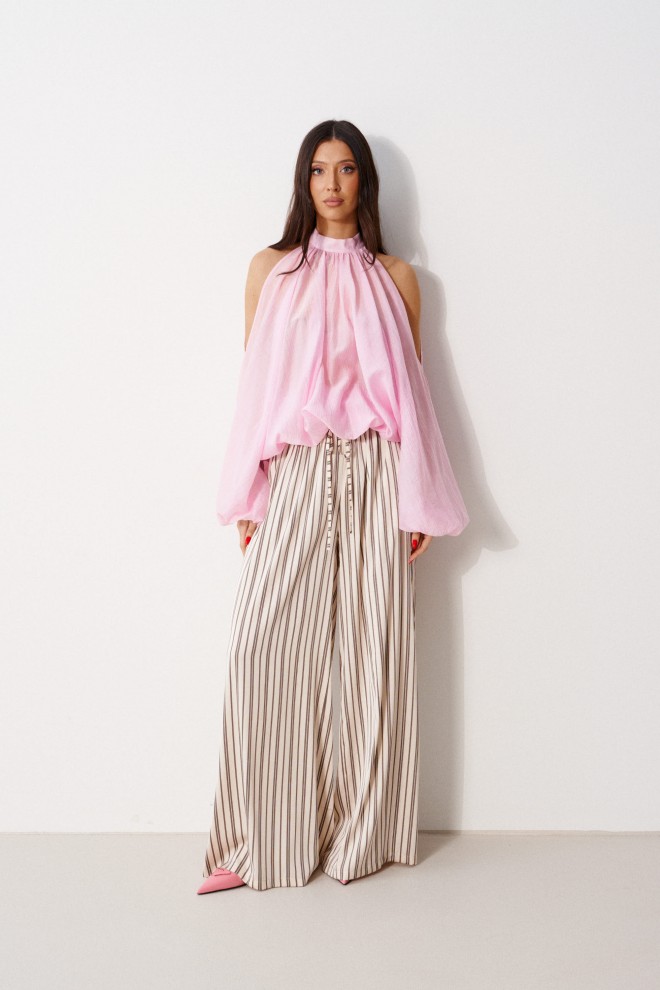 Брюки свободного кроя. Выполнены из мягкой струящейся ткани. Пояс на резинке, со шнурочком. В боковых швах карманы. Длина бокового шва (с учётом пояса) 109 см