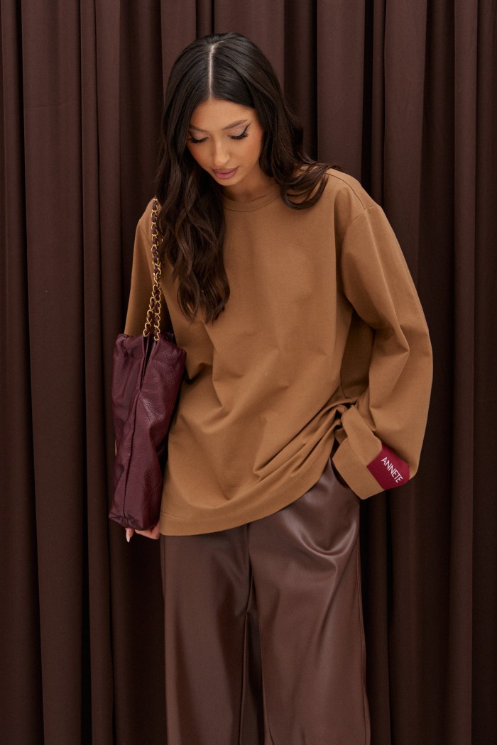 Джемпер прямого свободного кроя, выполнен из хлопкового полотна орехового цвета. Характеристики: прямой крой, овальный вырез горловины, рукав свободного кроя слегка спущен, брендированная нашивка ANNETE на рукаве. Длина по спинке 70 см, длина рукава от края горловины 75 см.