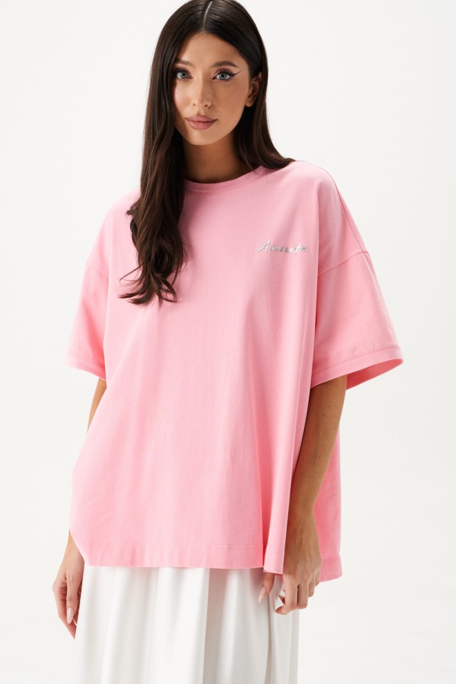 Футболка прямого свободного кроя, выполнена из хлопкового полотна розового цвета. Характеристики: прямой свободный крой, горловина овальная, рукав слегка спущен, горловина и край рукава выполнены из довяза, по передней части изделия слева декоративная объемная печать "Annete". Длина по центру спинки 69 см, длина рукава 18 см.