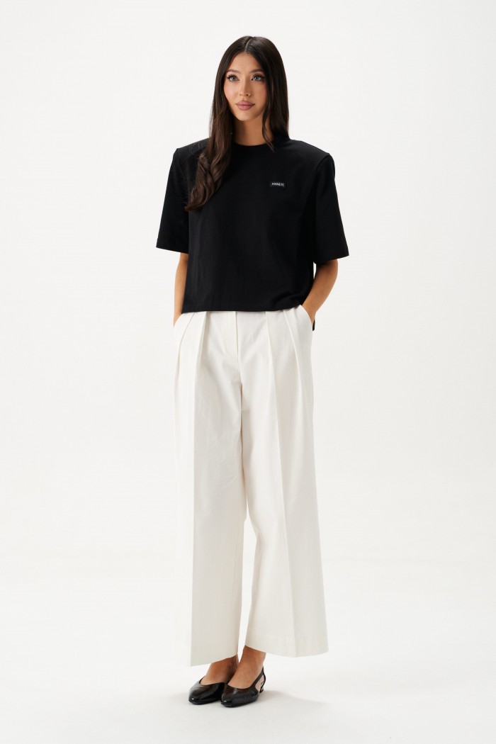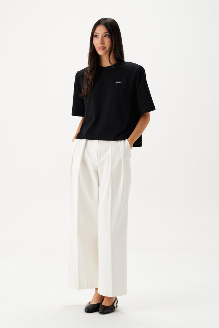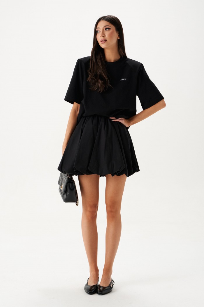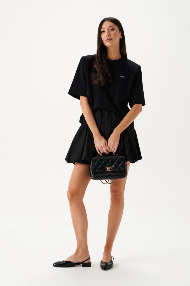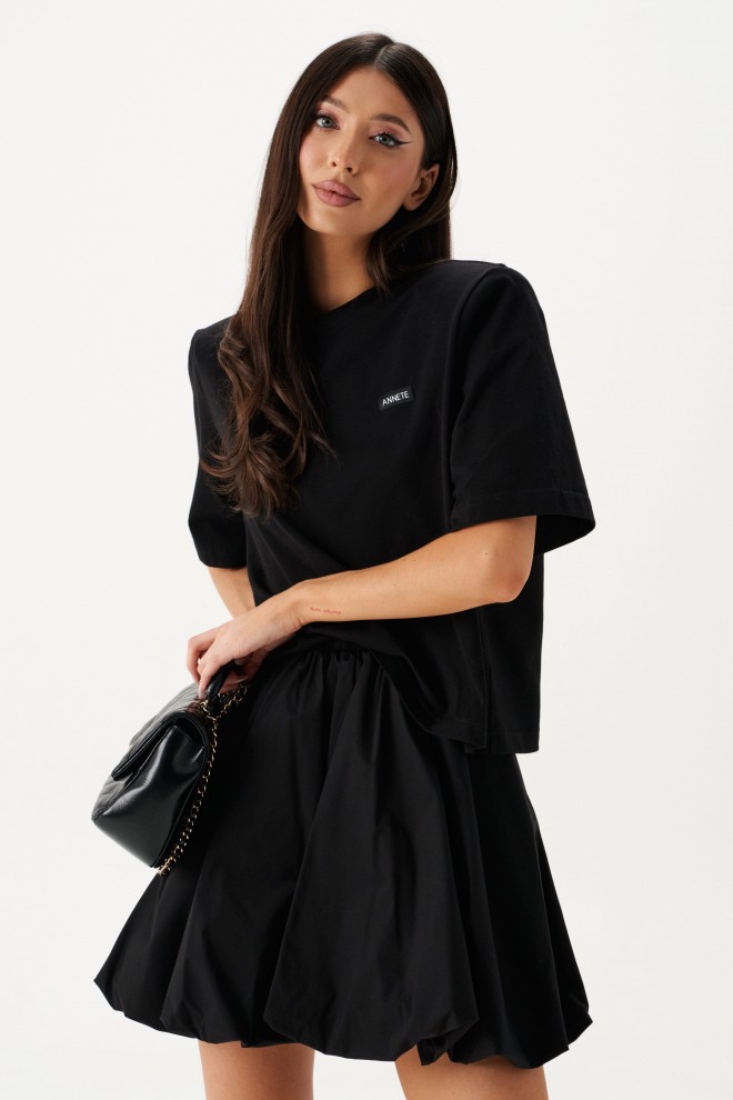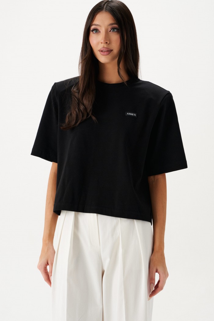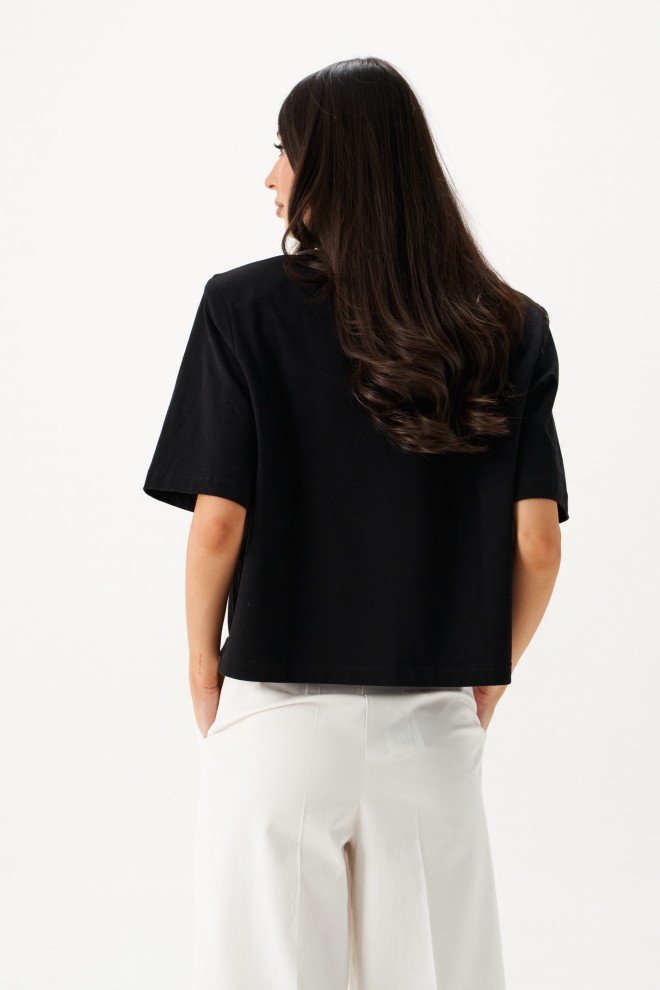 Джемпер прямого свободного кроя с акцентными плечами выполнен из хлопкового полотна черного цвета.