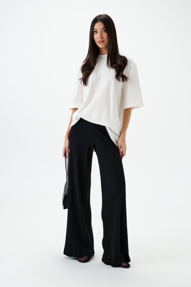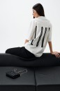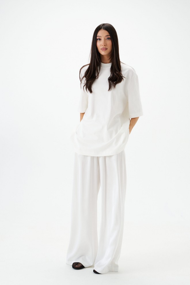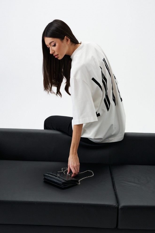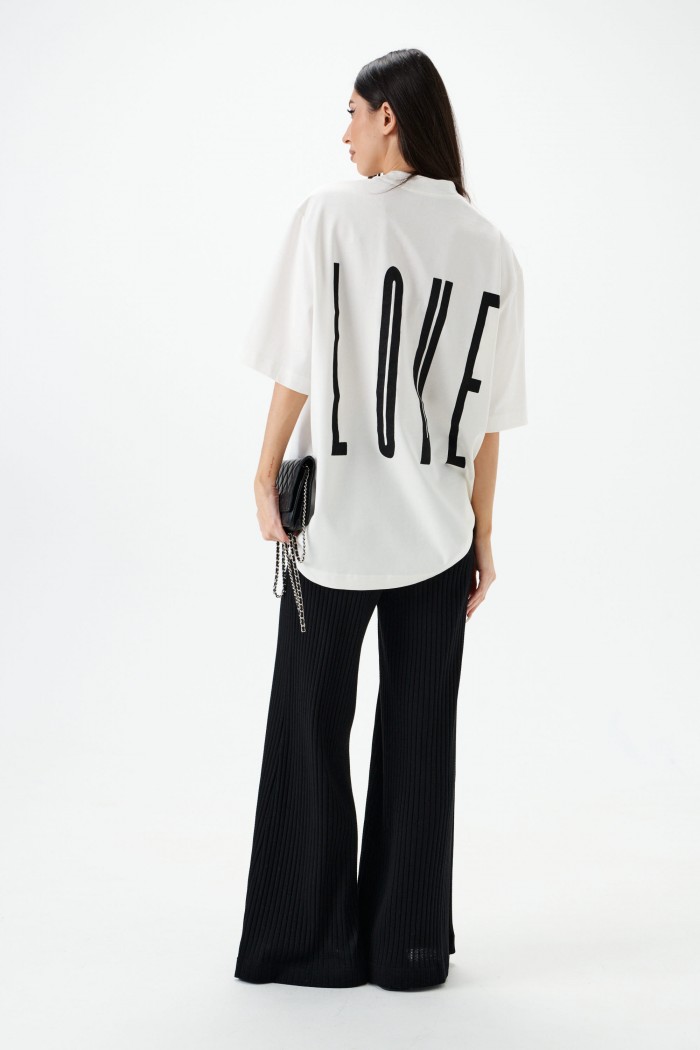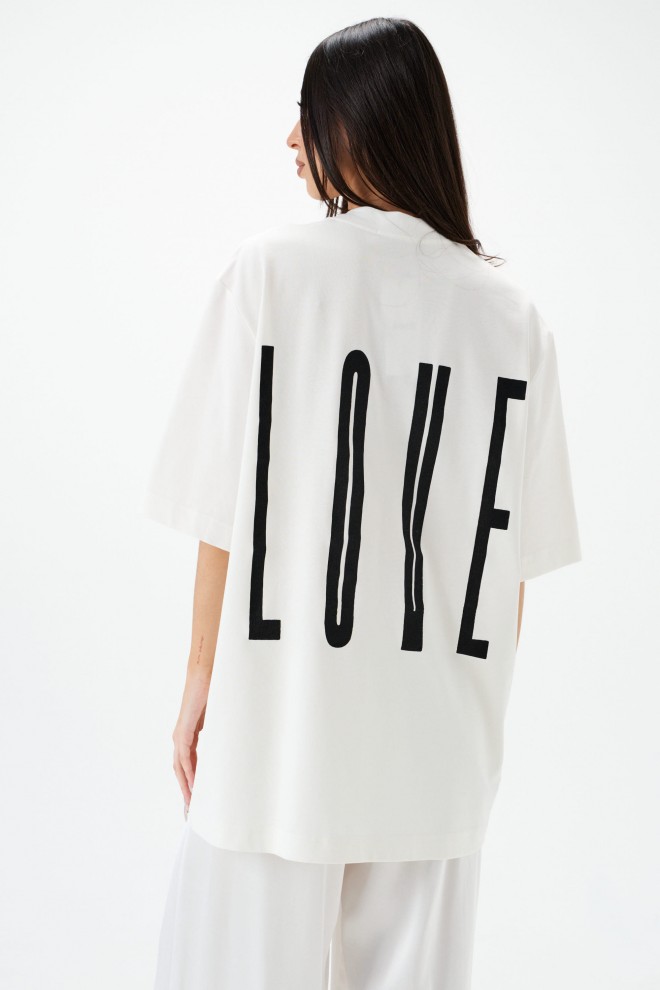 .Футболка прямого кроя, выполнена из хлопкового полотная тепло-белого цвета. Характеристика: прямой свободный крой, горловина овальная, рукав слегка спущен, на спинке печать "LOVE" черного цвета. Длина по центру спинки от края горловины 75 см, длина рукава от края горловины 39 см.