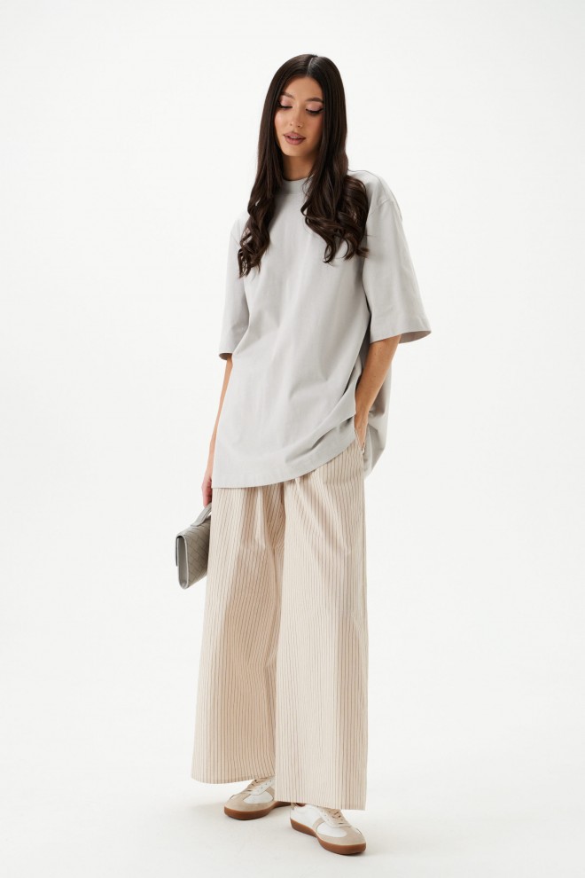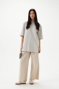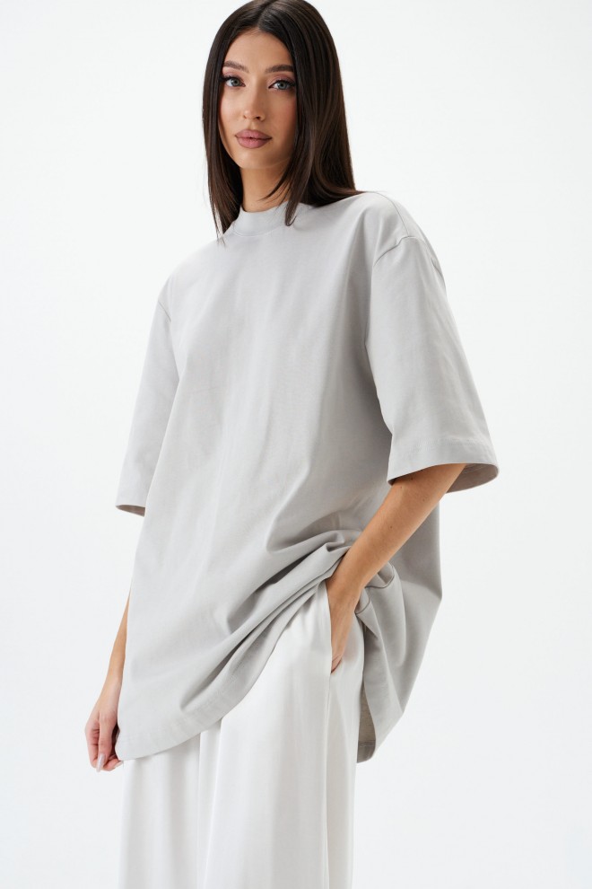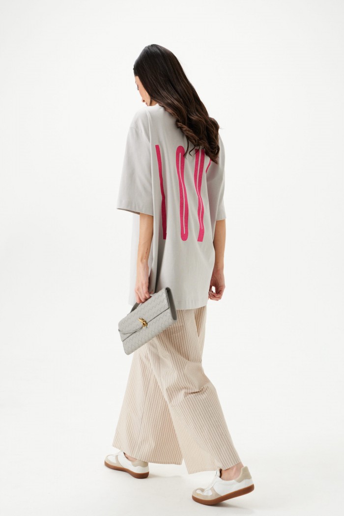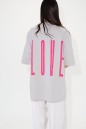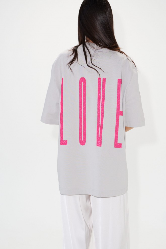 Футболка прямого кроя, выполнена из хлопкового полотная серого цвета. Характеристика: прямой свободный крой, горловина овальная, рукав слегка спущен, на спинке печать "LOVE" розового цвета. Длина по центру спинки от края горловины 75 см, длина рукава от края горловины 39 см.
