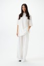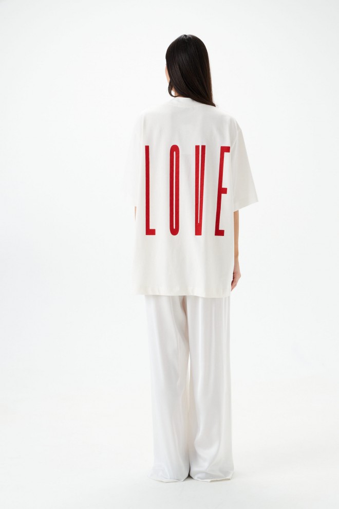 Футболка прямого кроя, выполнена из хлопкового полотная тепло-белого цвета. Характеристика: прямой свободный крой, горловина овальная, рукав слегка спущен, на спинке печать "LOVE" красного цвета. Длина по центру спинки от края горловины 75 см, длина рукава от края горловины 39 см.