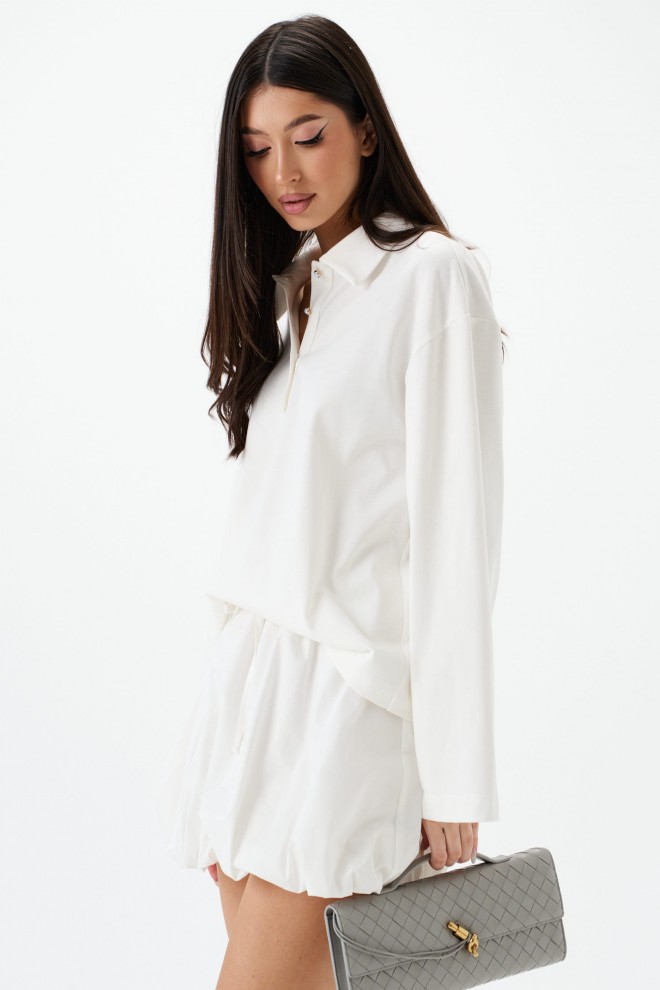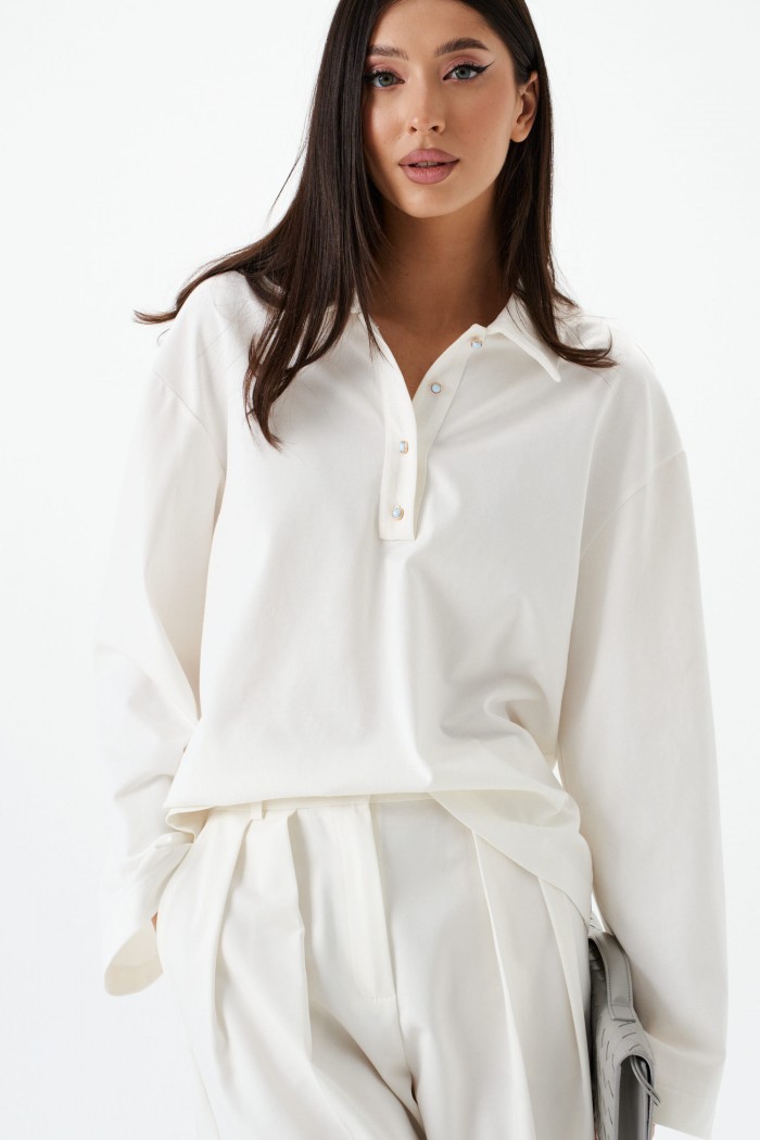 Джемпер-поло. Выполнен из трикотажного полотна. Прямой крой. Отложной воротник. Застёжка – пуговички. Рукав втачной, немного спущен. Длина рукава от линии втачивания 57 см. Длина спинки 59 см
