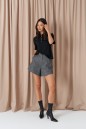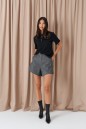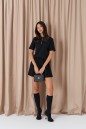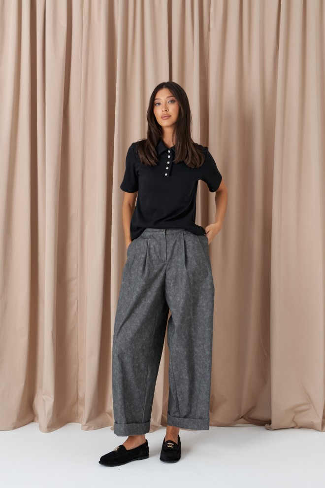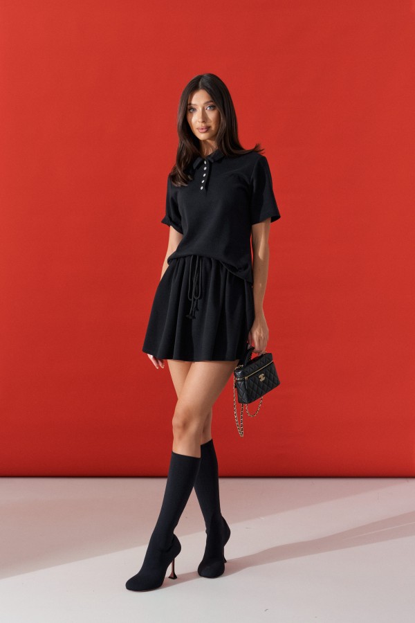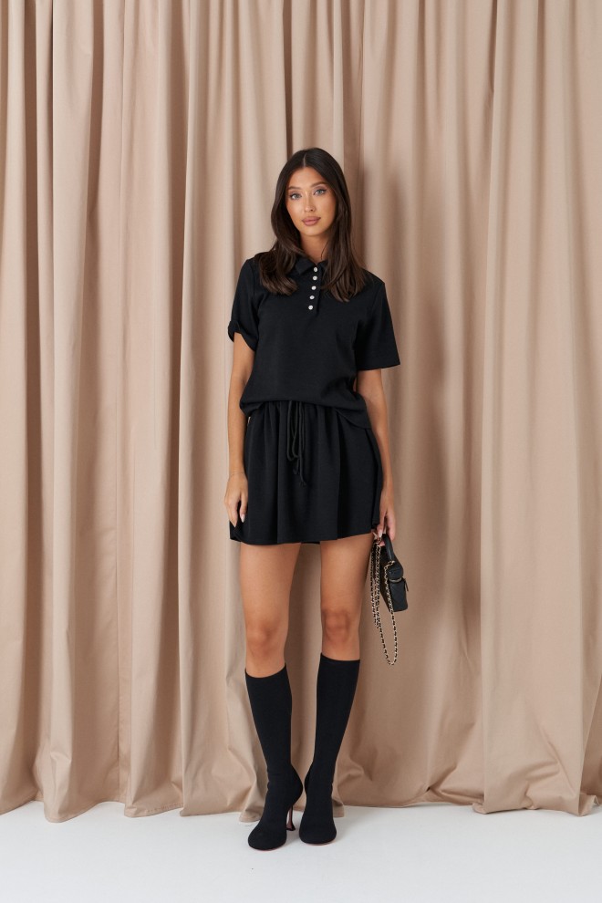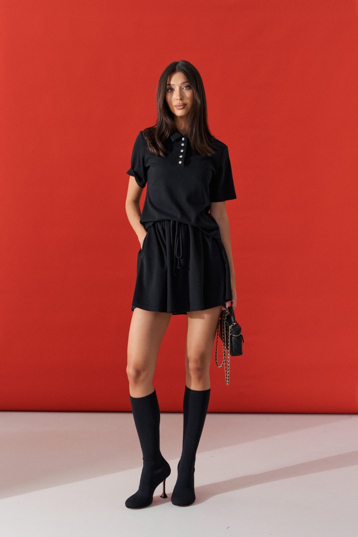 Джемпер-поло прямого кроя. Выполнен из мягкого трикотажа чёрного цвета. Воротник отложной. Застёжка пуговички на планке. Рукав втачной, короткий. Длина спинки 54 см. Длина рукава от линии втачивания 20 см