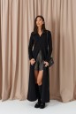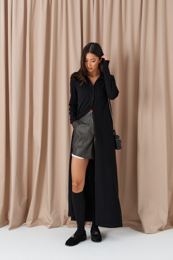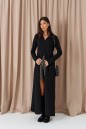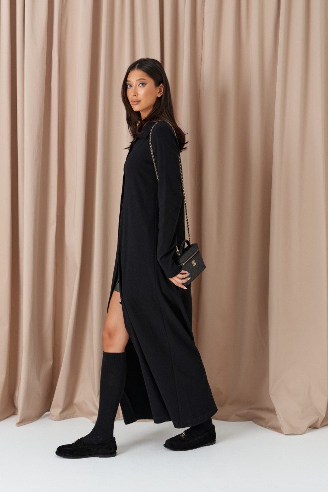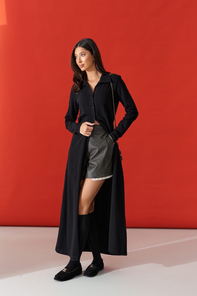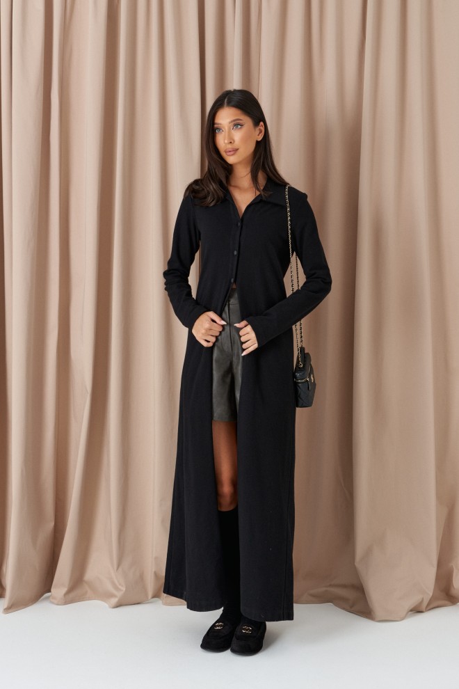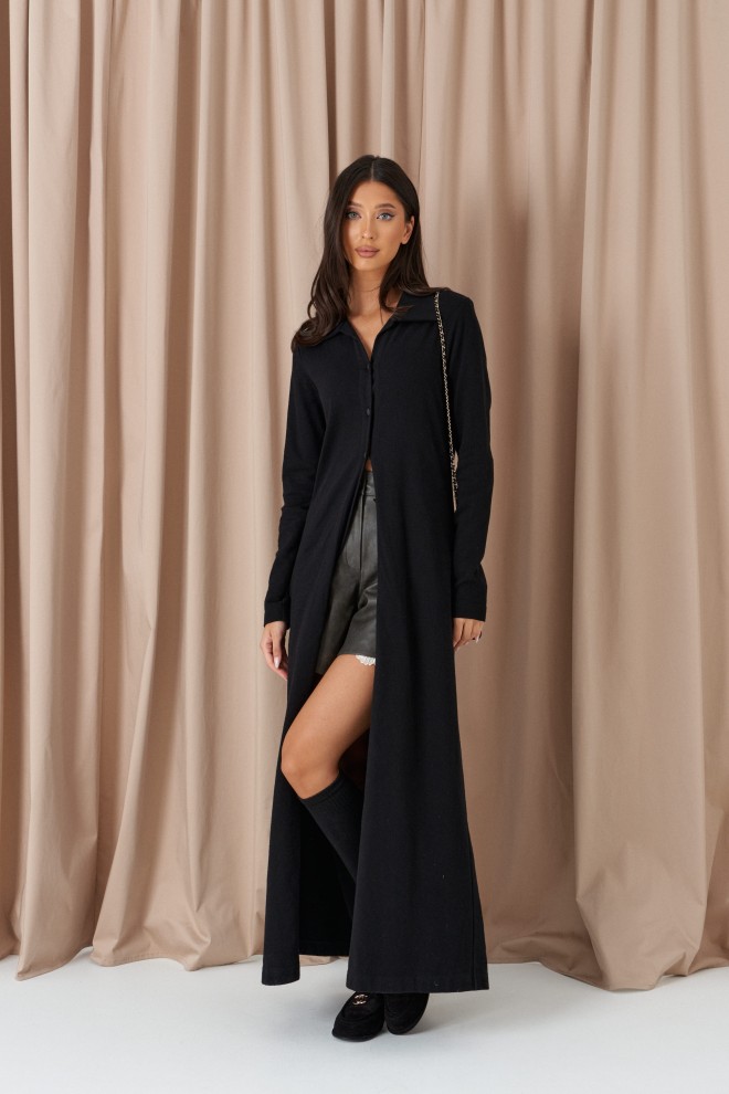 Джемпер удлиненный свободного кроя, выполнен из трикотажа черного цвета. Характеристика: свободный крой, расширение к низу, отложной воротник, застежка центральная на пуговицы, цельнокройная спинка, рукав вточной. Длина изделия по спинке 142см, длина рукава 64см.