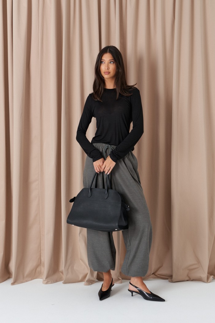 Джемпер прилегающего силуэта выполнен из полупрозрачного полотна черного цвета. Характеристики: прилегающий силуэт, горловина стойка, рукав длинный втачной. Длина от края горловины 57см, длина рукава от края горловины 74 см.