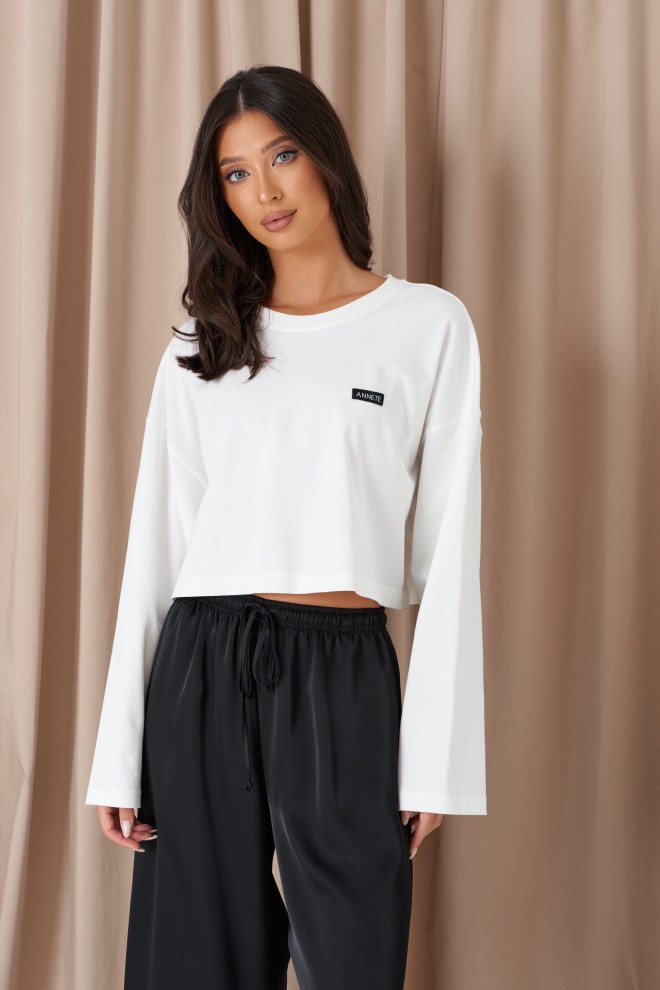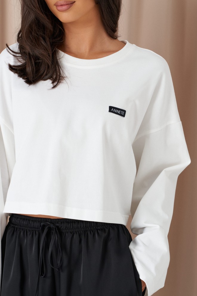 Джемпер прямого свободного кроя,выполнен из трикотажного полотна белого цвета. Характеристики: прямой крой, овальный вырез горловины, спинка цельнокроеная, по переду брендированная нашивка, рукав спущен. Длина по спинке 41 см, длина рукава от края горловины 76см.