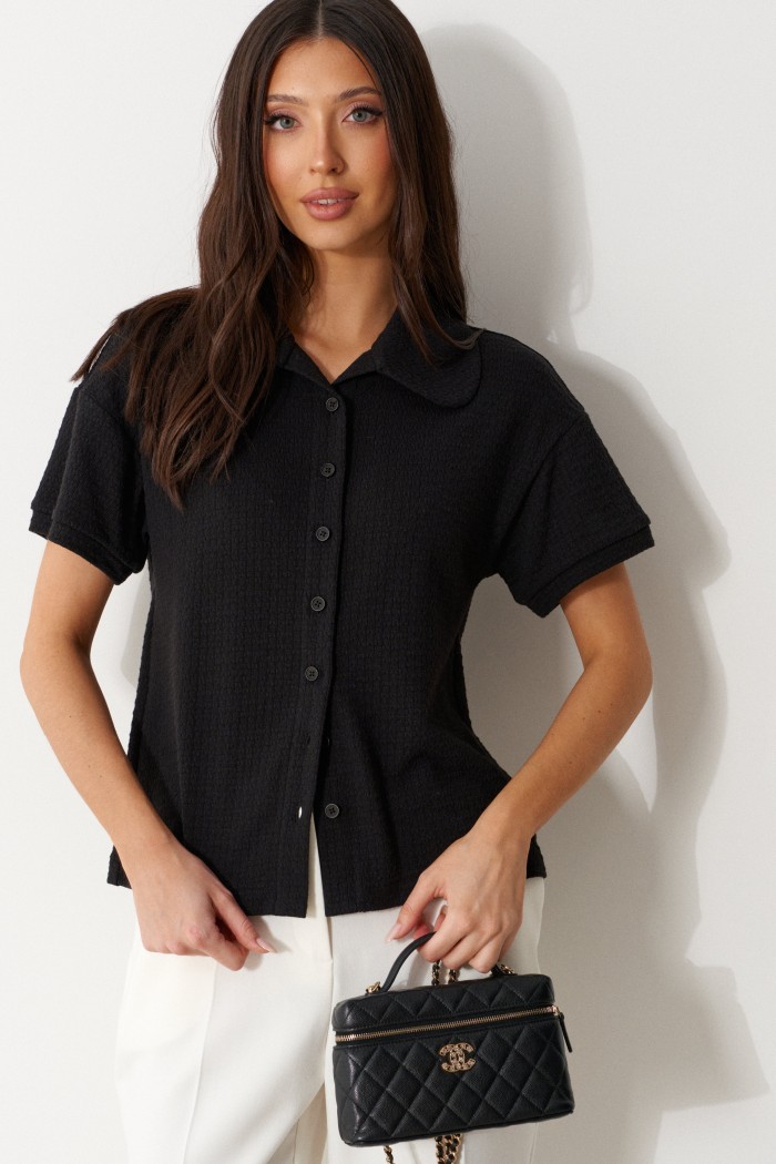 Джемпер свободного кроя, выполнен из трикотажного полотна черного цвета. Характеристика: отложной воротник с закругенными краями, центральная застежка на петли-пуговицы, чуть спущенное плечо, рукав вточной, короткий. Длина рукава от горловины 33см. Длина по спинке 60см