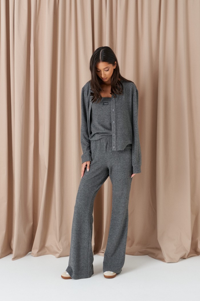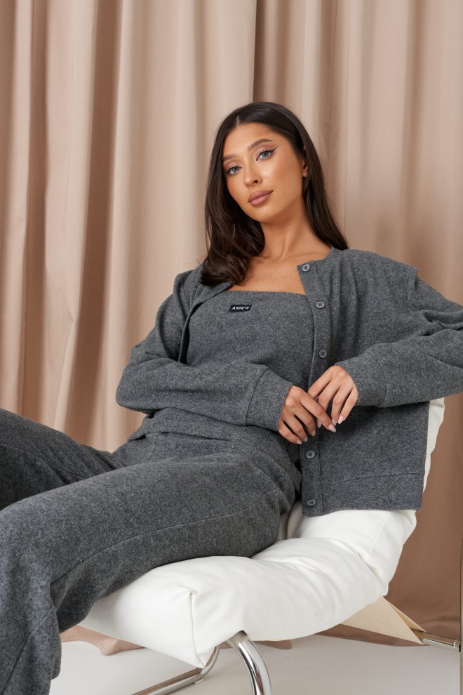 Джемпер прямого кроя, выполнен из трикотажного ворсистого полотна серого цвета. Характеристика: прямой крой, воротник стойка, застежка центральная планка на петли-пуговицы, по низу платная чуть заужена, рукав втачной, манжет широкий. Длина рукава от края горловины 78см, длина изделия по спинке 51см.