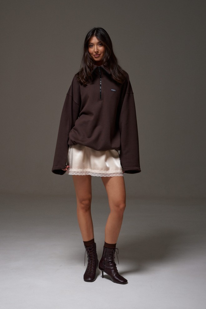 Джемпер прямого свободного кроя выполнен из хлопокового полотна двухнитки шоколадного цвета. Характеристики: прямой крой, широкий отложной воротник, центральная застежка-молния, рукав втачной спущенный, манжет на резинке с фиксаторами, по низу изделие собирается на резинку с фиксаторами. Длина рукава от края горловины 79 см, длина по спинке от шва горловины 71 см.