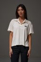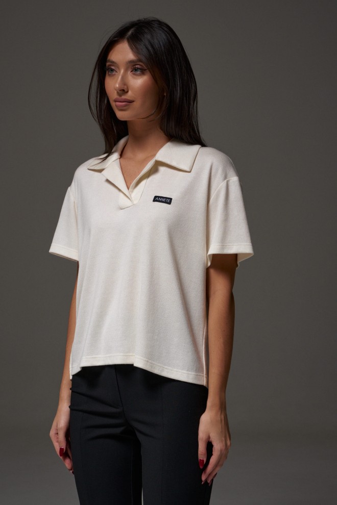 Джемпер прямого кроя выполнен из трикотажного полотна молочного цвета. Характеристики: прямой крой, V-образный вырез горловины с отложным воротником, рукав короткий, втачной, длина 17,5 см. Длина по спинке 57 см.