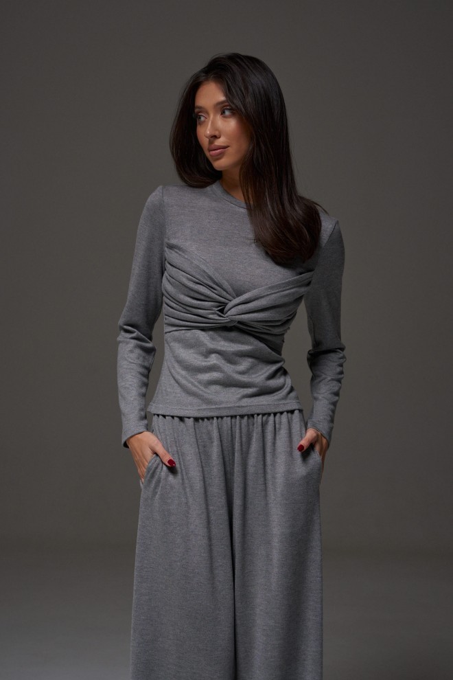 Джемпер прилегающего силуэта, выполнен из трикотажного полотна серого цвета. Характеристики: прилегающий силуэт, овальная горловина, рукав втачной, по переду изделия декоративный узел. Длина от края горловины 56 см, длина рукава от края горловины 77 см.