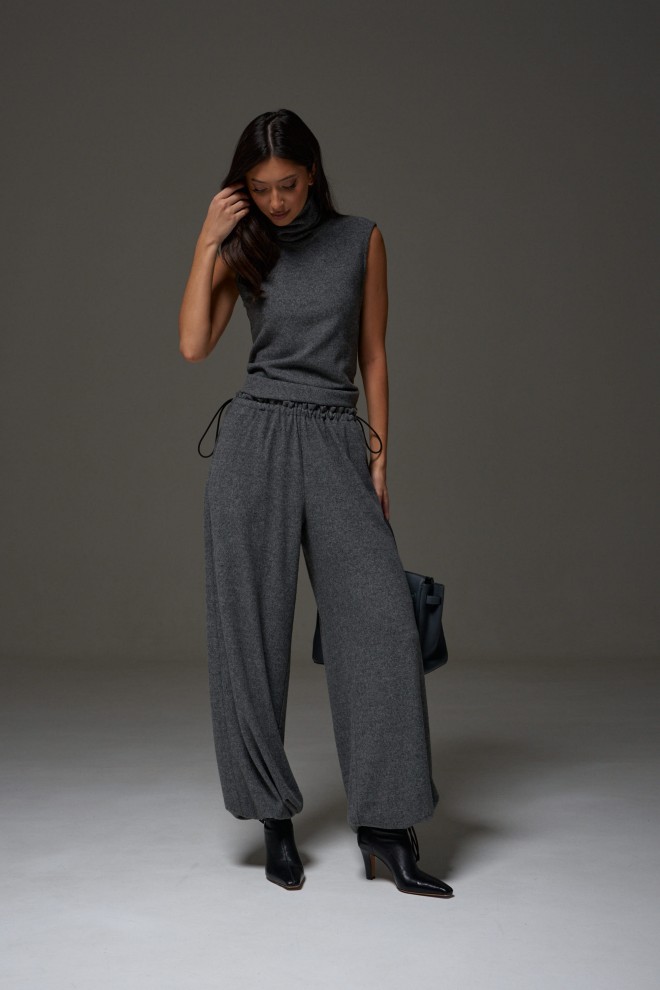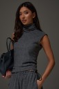 Джемпер без рукавов прилегающего силуэта, выполнен из мягкого ворсистого трикотажного полотна серого цвета. Характеристики: Горловина-стойка, в естественную складку. Длина спинки от края горловины 54 см.