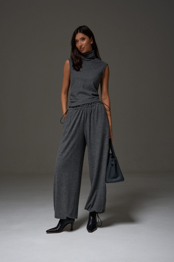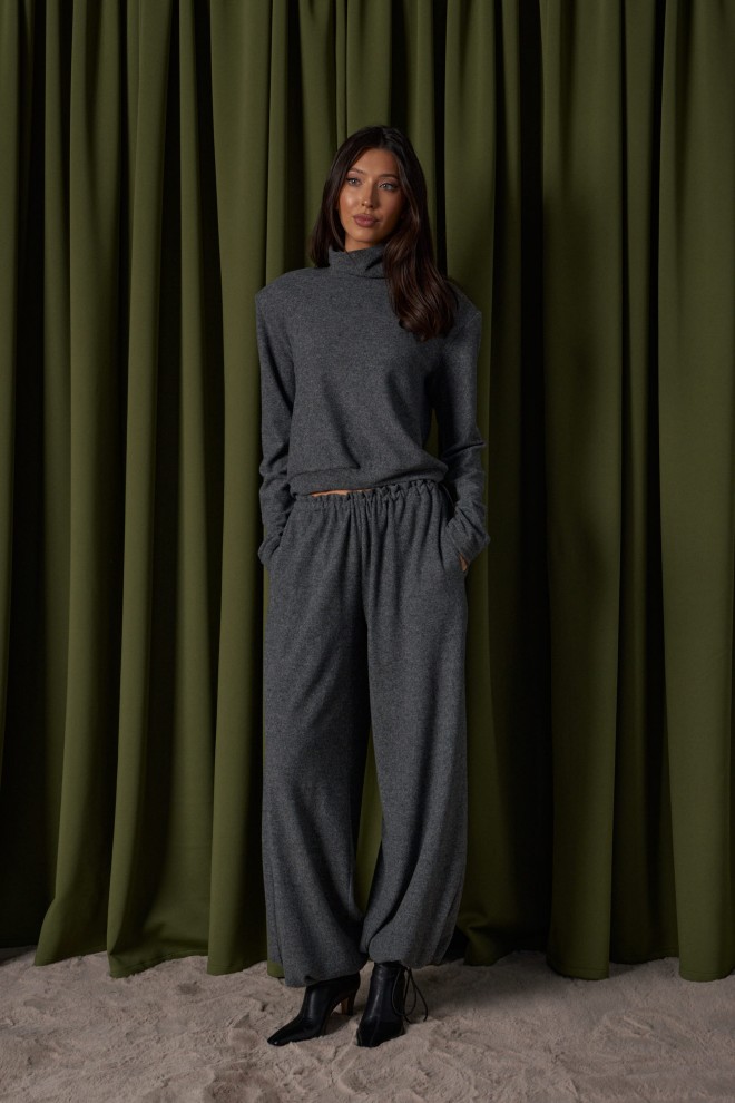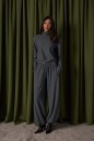 Джемпер укороченный прямого свободного кроя. Выполнен из мягкого трикотажа светло-серого цвета. Горловина-стойка, в естественную складку. Есть подплечники (съёмные). Длина рукава от линии втачивания 61 см. Длина спинки 50 см