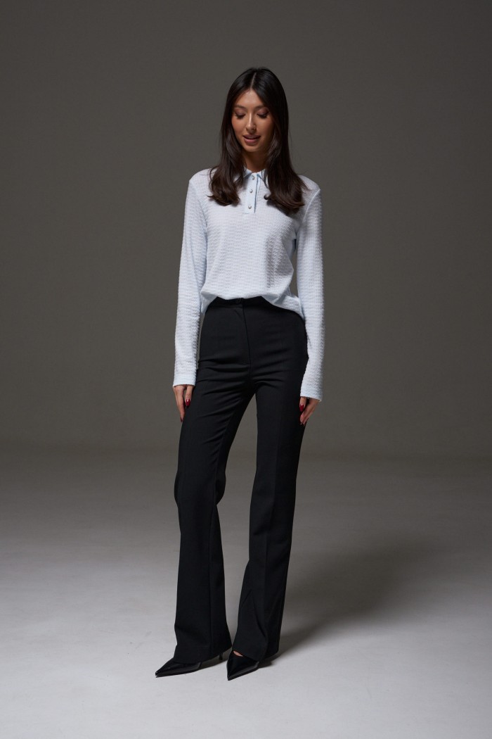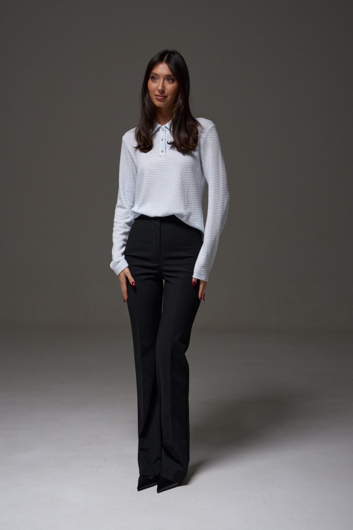 Джемпер-поло прямого кроя. Выполнен из фактурного трикотажа голубого цвета. Воротник отложной. Застёжка пуговички на планке. Рукав втачной, длинный. Длина спинки 55см. Длина рукава от линии втачивания 64 см