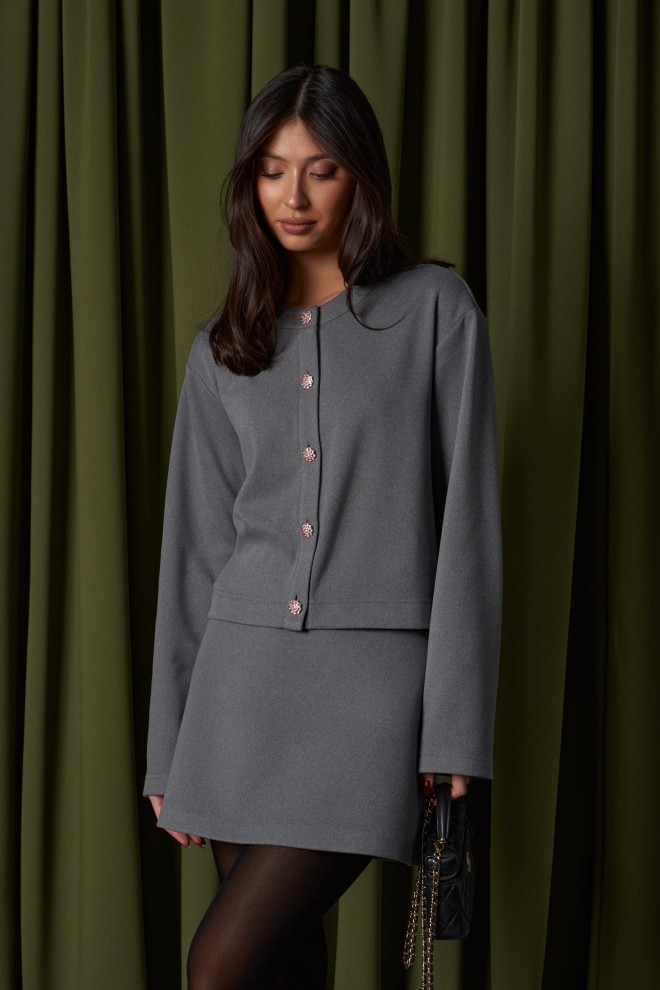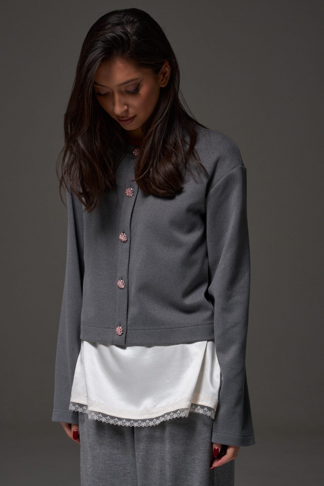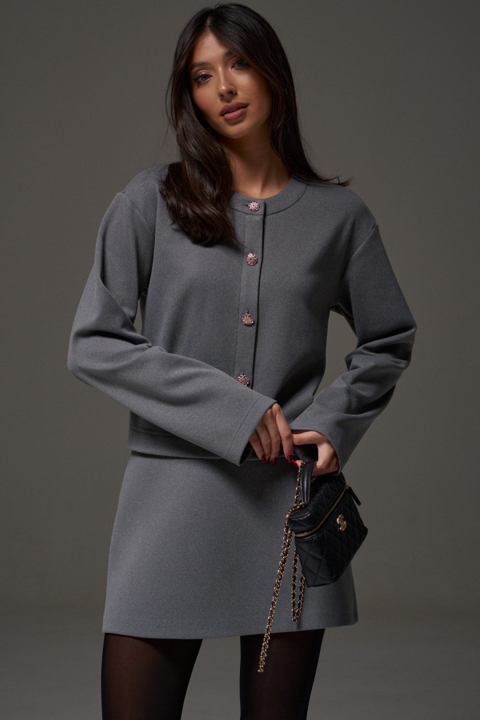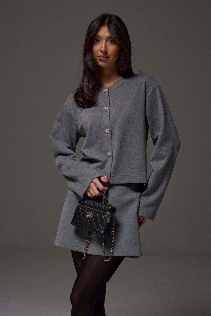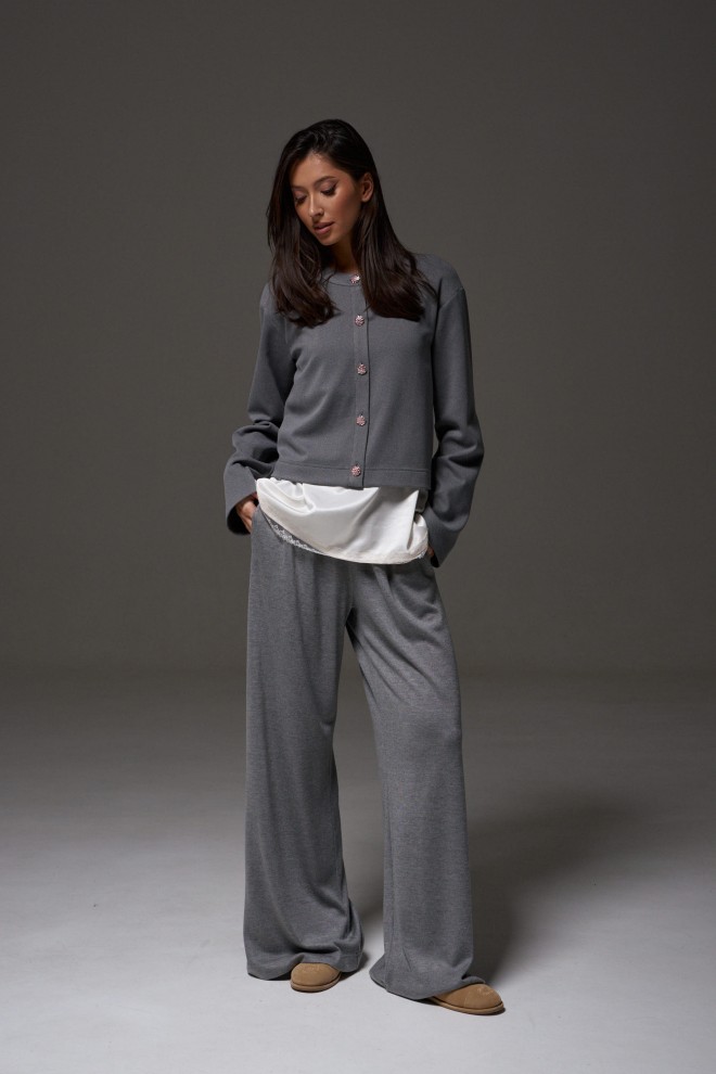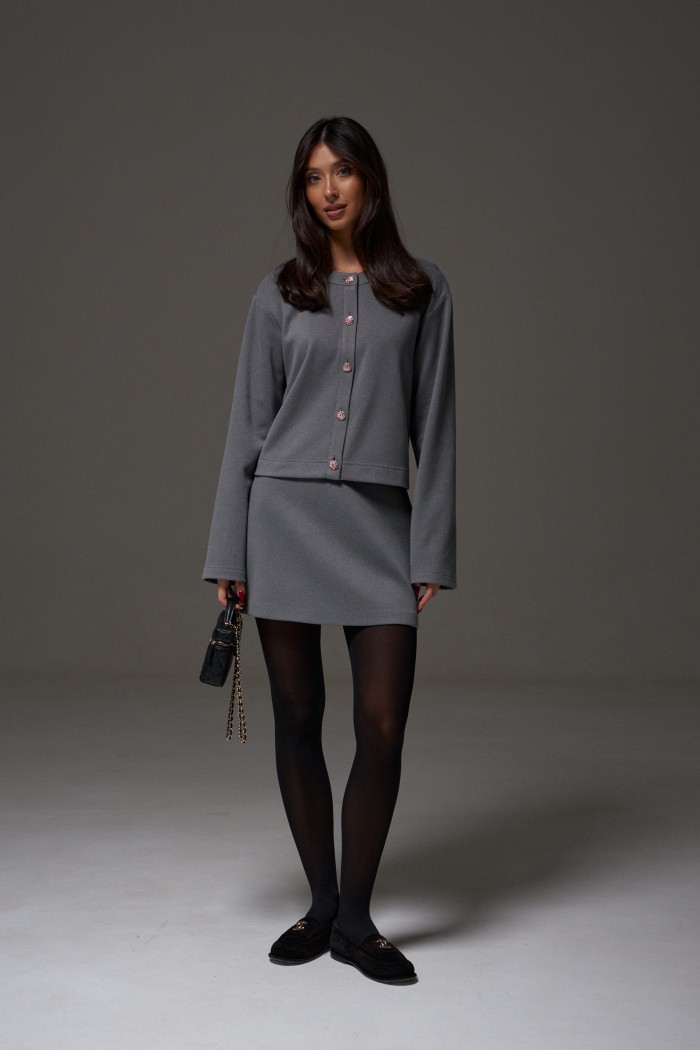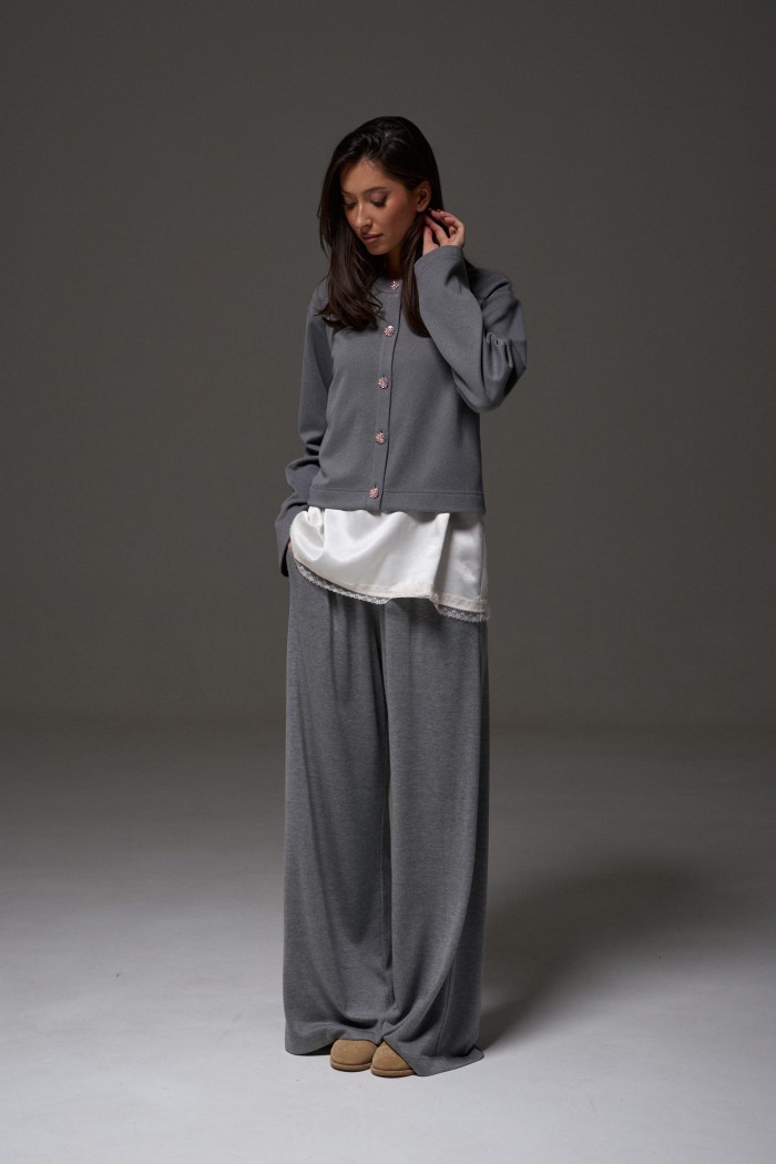 Джемпер прямого кроя выполнен из мягкого трикотажного полотна. Характеристика: прямой крой, овальная горловина, застежка центральная на петли - акцентные пуговицы. Рукав втачной, спущен. Спинка цельнокраеная. Длина по спинке 47см, длина рукава от края горловины 76см.