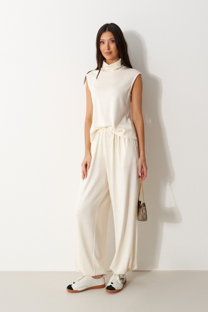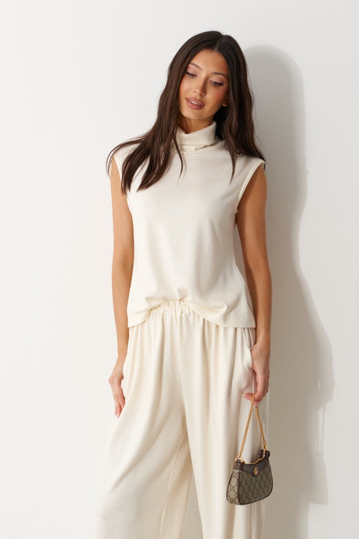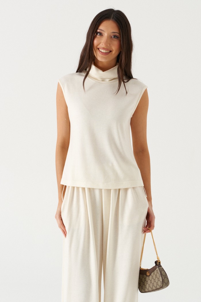 Джемпер без рукавов прилегающего силуэта, выполнен из трикотажного полотна молочного цвета. Характеристики: горловина-стойка, в естественную складку, прямой крой, без рукавов. Длина по центру спинки от края горловины 54 см.