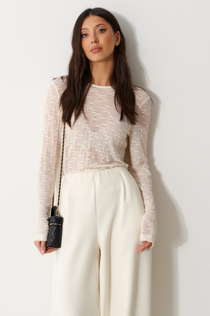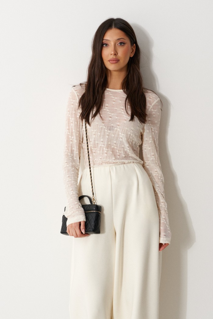 Джемпер прилегающего силуэта. Выполнен из кружевного полотна цвета шампанского. Характеристика: горловина обработана косой бейкой. Рукав одношовный втачной. Низ рукава и низ изделия обработаны в подгибку с открытым срезом. Длина рукава 68 см, длина джемпера по спинке 58 см.