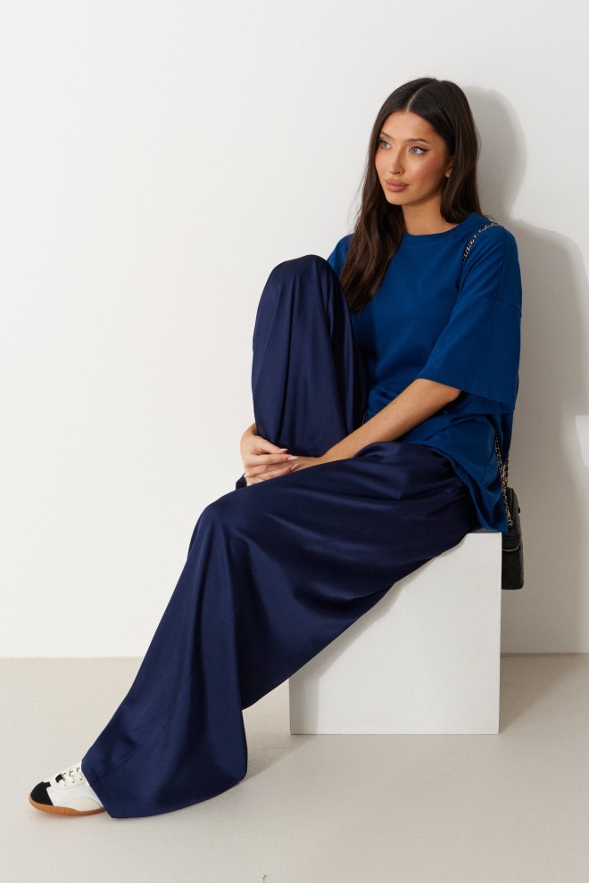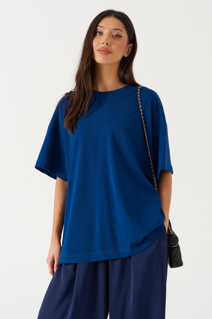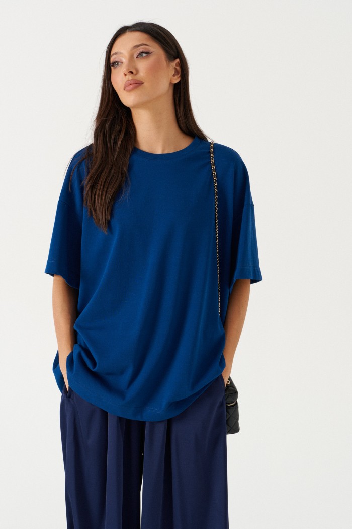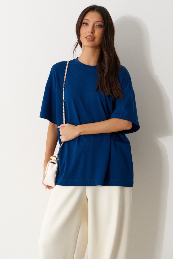 Футболка прямого свободного кроя, выполнена из хлопкового полотна глубокого синего цвета. Характеристики: прямой свободный крой, горловина овальная, край выполнен из довяза, рукав слегка спущен, по центру спинки изделия, под горловиной брендированная нашивка "Annete". Длина по центру спинки 69 см, длина рукава от края горловины 41см.