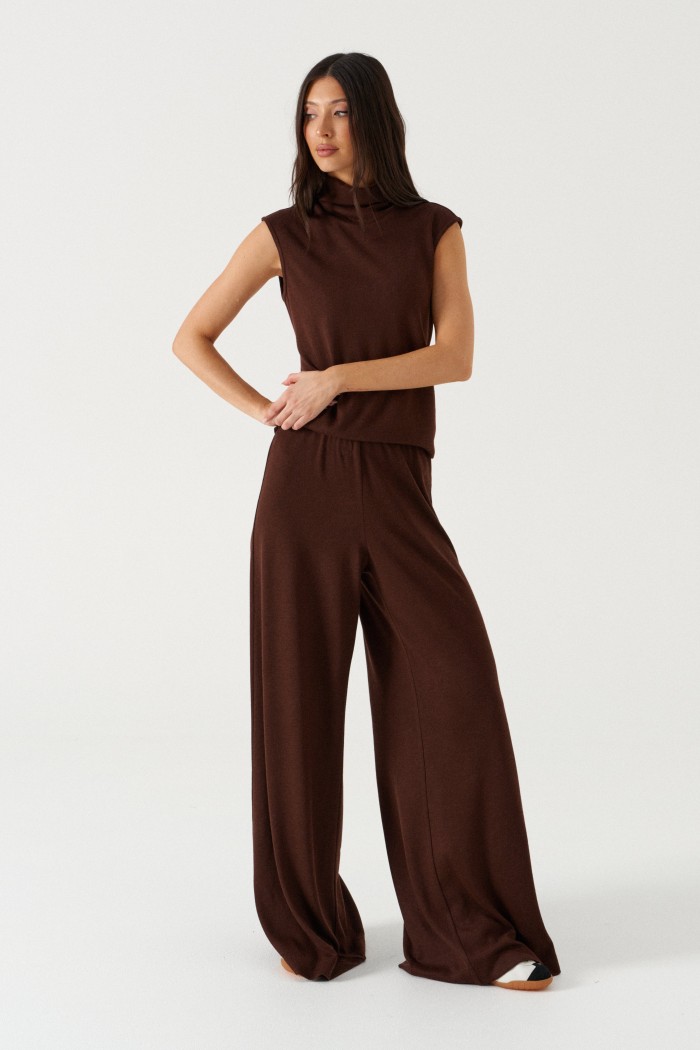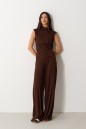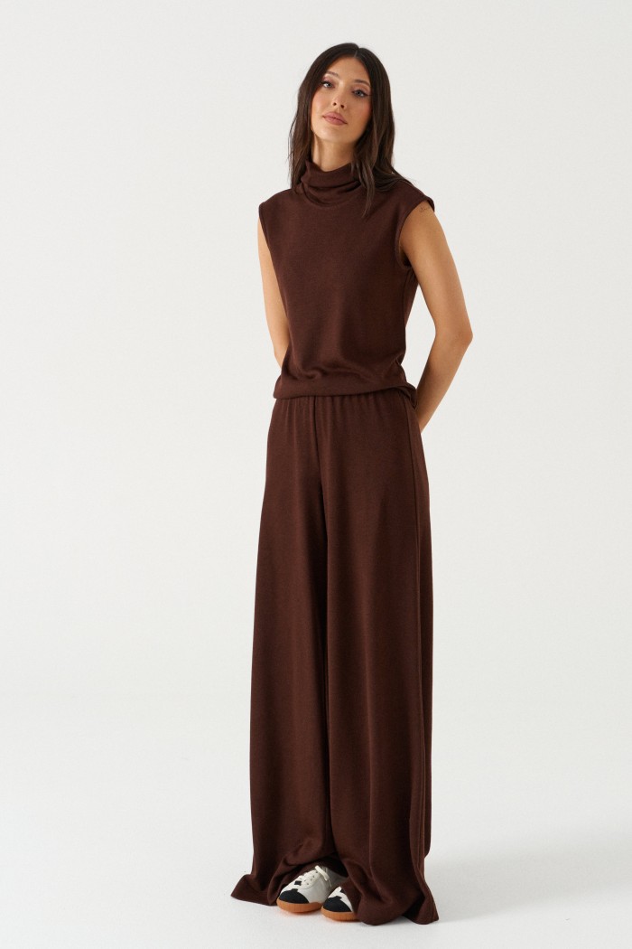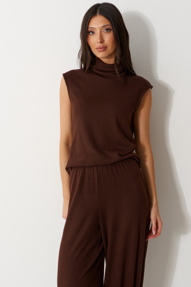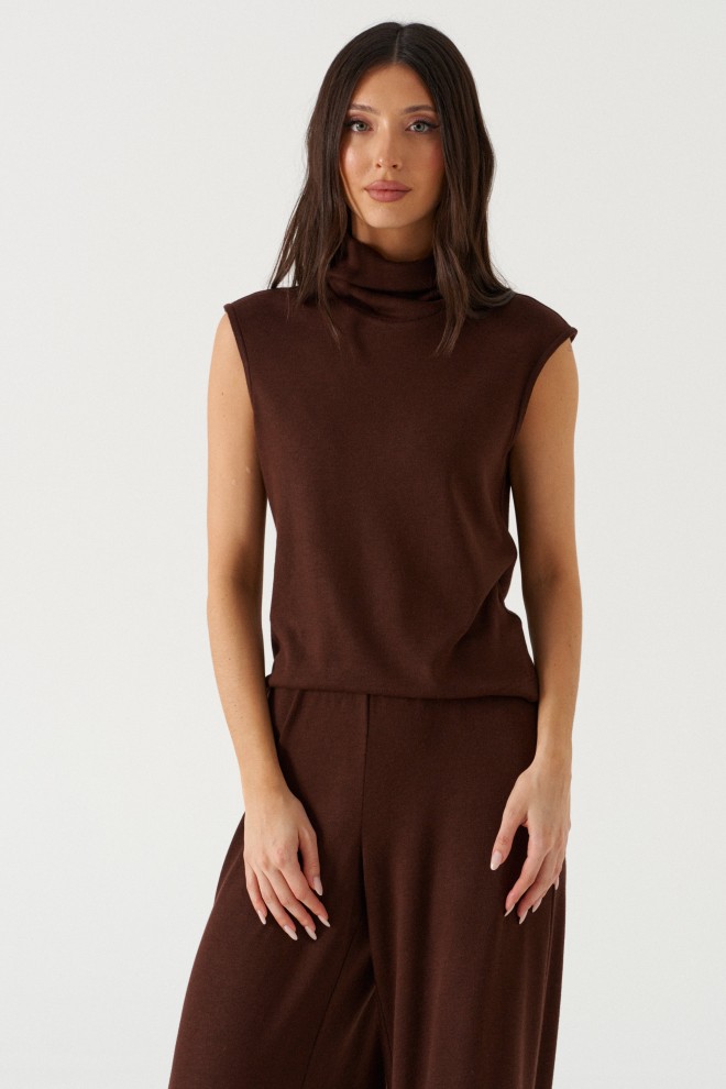Джемпер свободного кроя. Выполнен из мягкого трикотажа коричневого цвета. Горловина-стойка, в естественную складку. Длина спинки 55 см