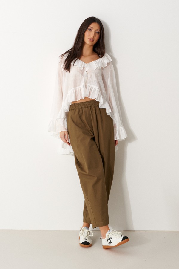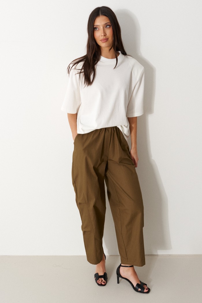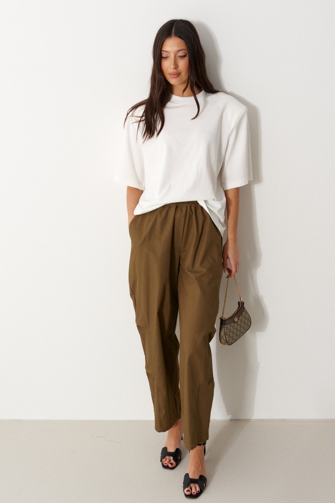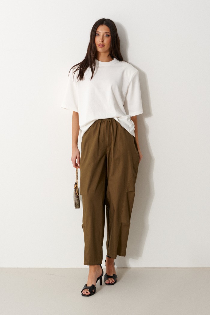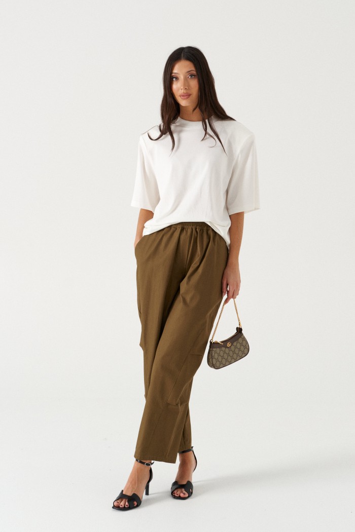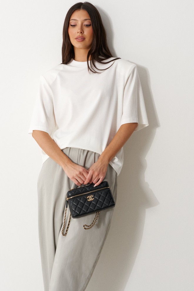 Футболка прямого силуэта. Выполнен из хлопкового полотна белого цвета. Характеристика: вырез горловины круглый с притачной планкой-резинкой. Рукав одношовный, втачной, короткий. Подплечники. Длина по спинке 59 см, длина рукава от горловины 29 см.