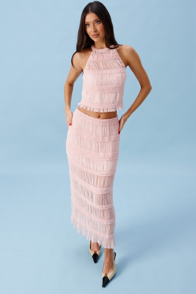 Топ полуприлегающего силуэта. Выполнен из прозрачной фактурной ткани нежно-розового цвета. По переду с подкладкой. Застежки в изделии нет. Длина спинки 44 см
